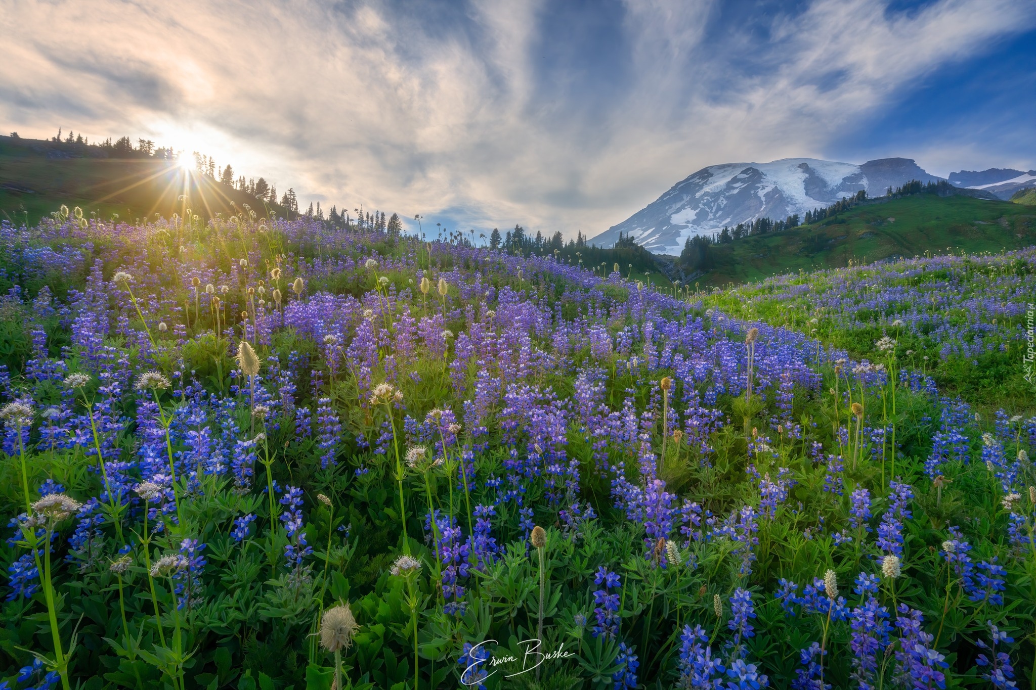 Edytor tapety: Widok z łubinowej łąki na górę Mount Rainier