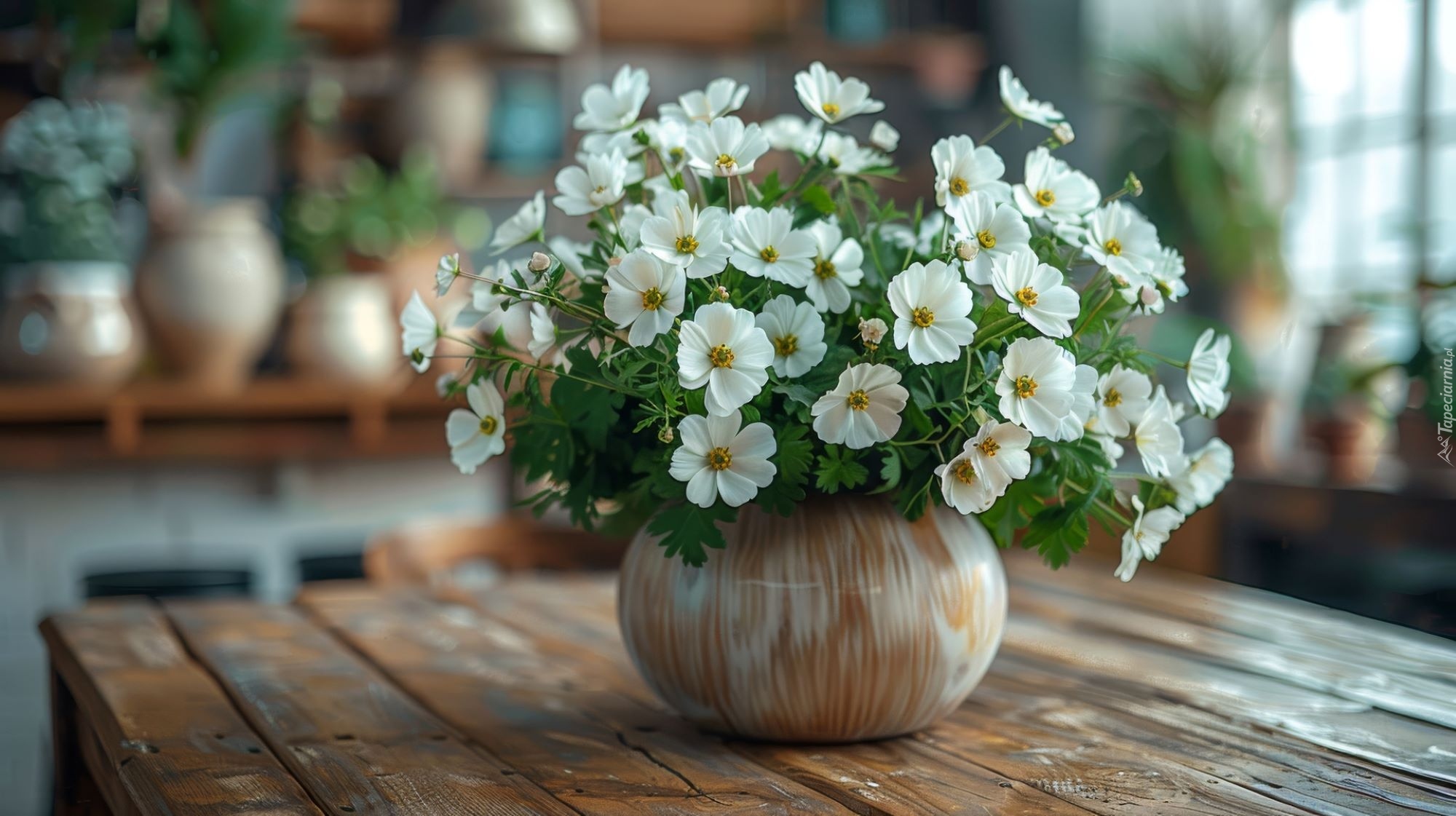 Edytor tapety: Białe kwiaty w wazonie na drewnianym stole