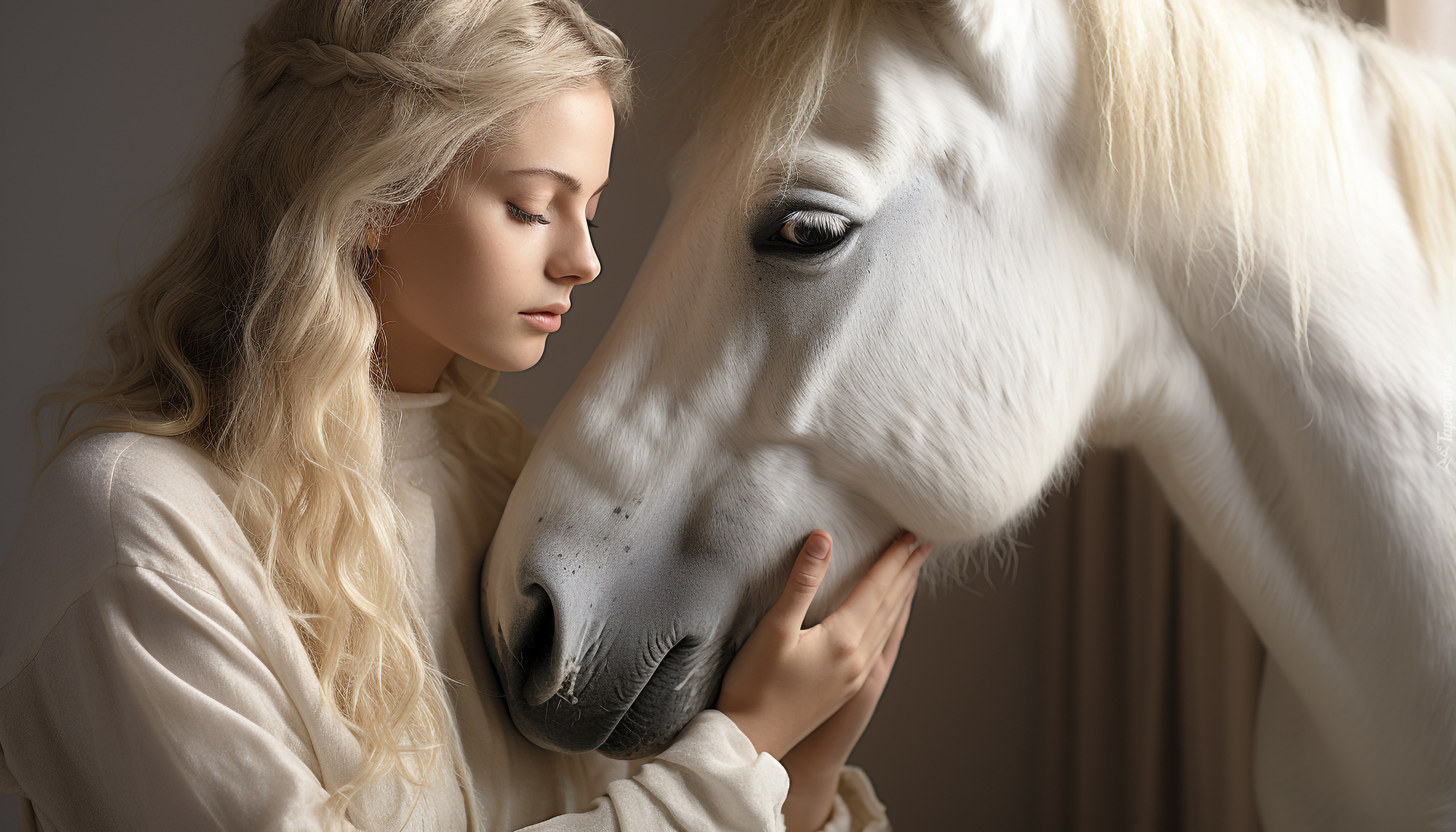 Edytor tapety: Długowłosa blondynka i biały koń
