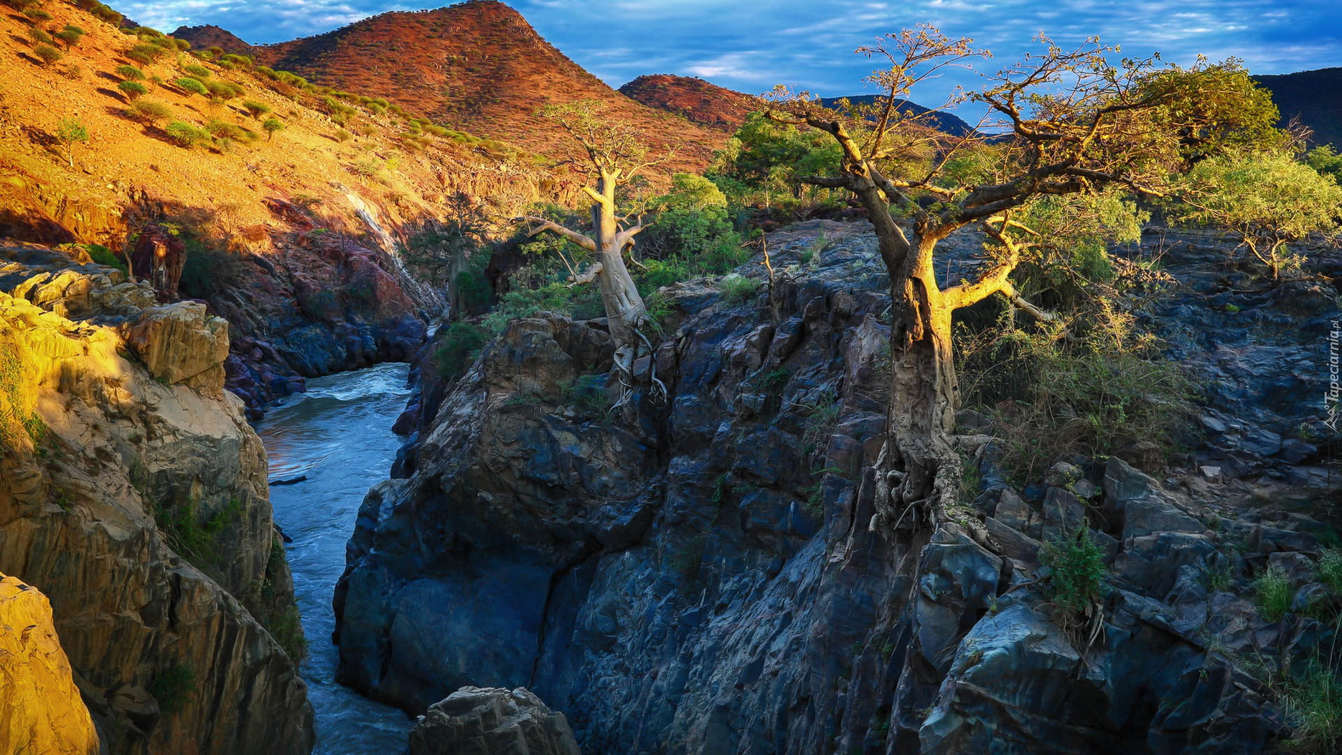 Edytor tapety: Drzewa na skałach i rzeka w wąwozie