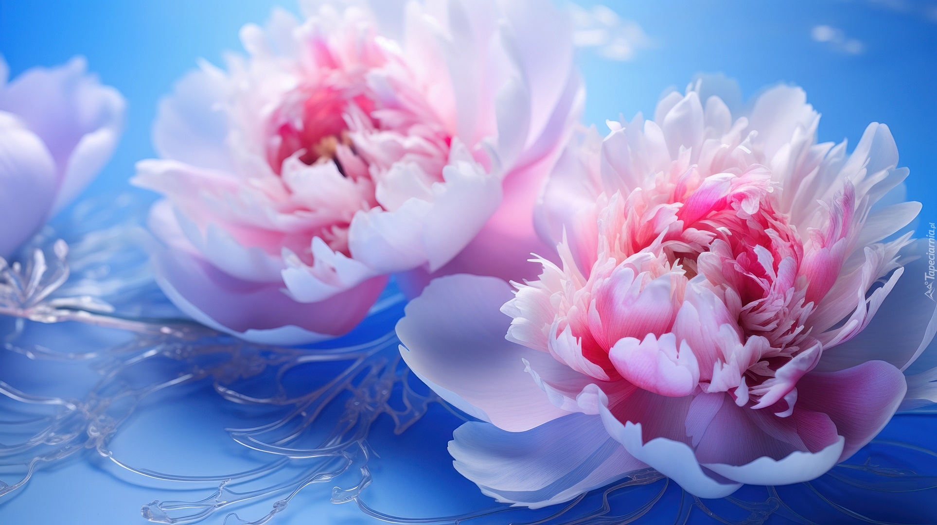 Edytor tapety: Rozwinięte jasnoróżowe piwonie na niebieskim tle