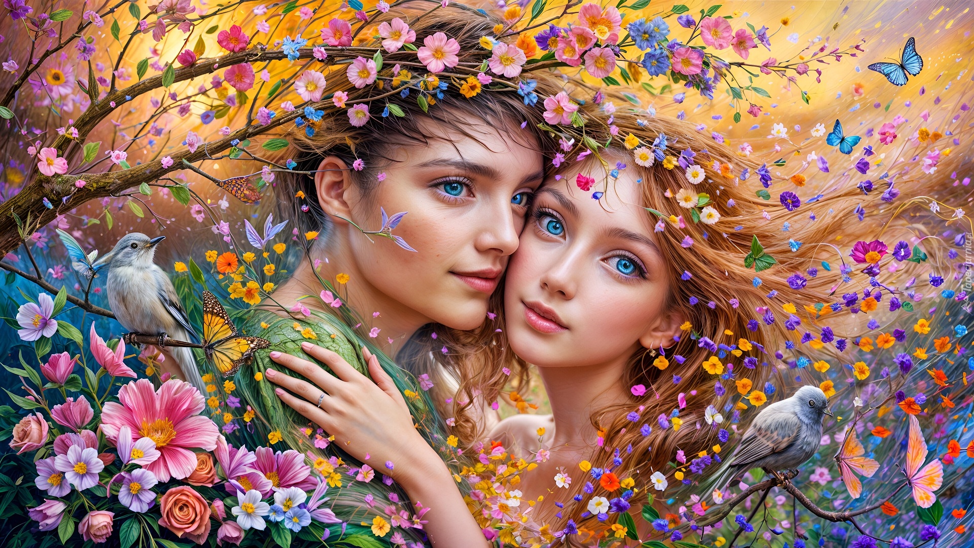 Edytor tapety: Przytulona zakochana para na tle ukwieconych gałązek