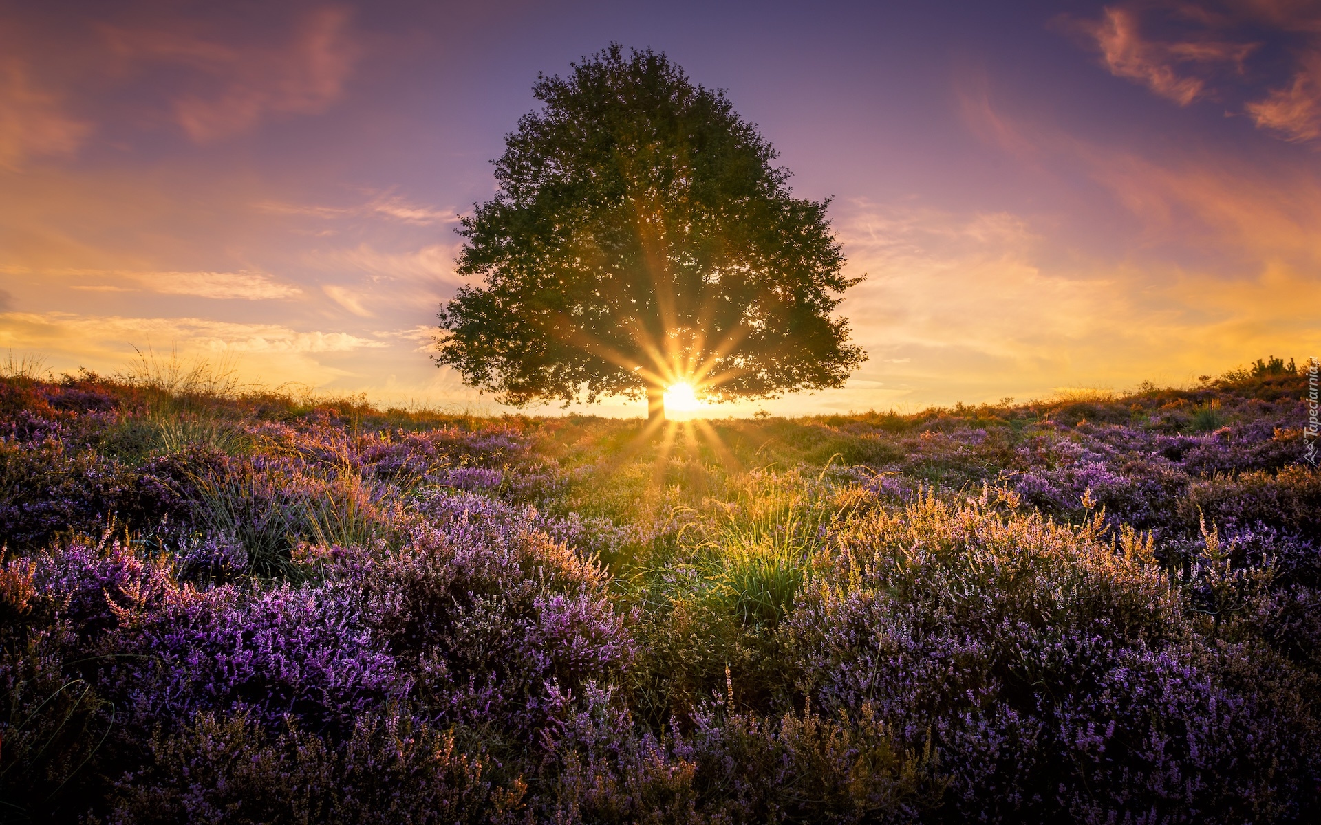 Edytor tapety: Samotne drzewo na wrzosowisku w promieniach słońca