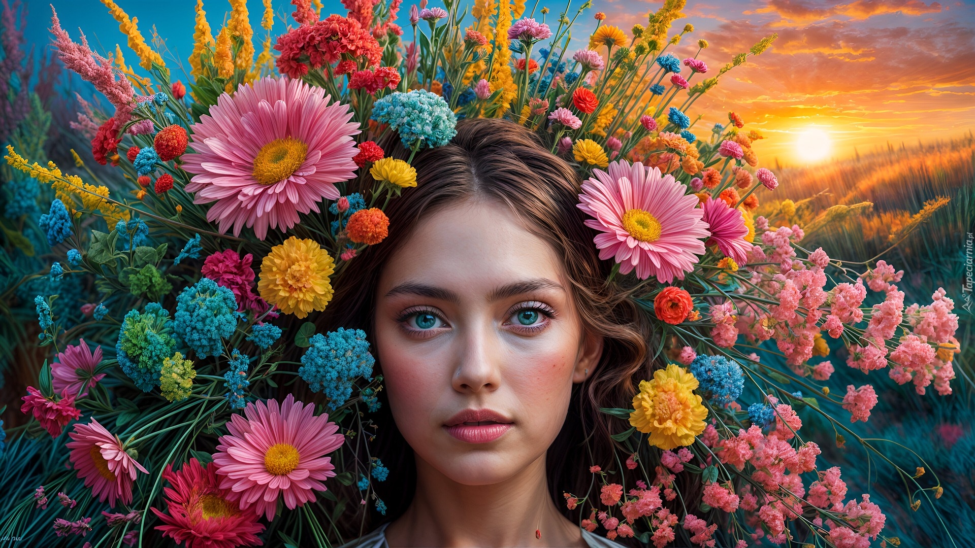Edytor tapety: Dziewczyna i kwiaty na tle zachodu słońca