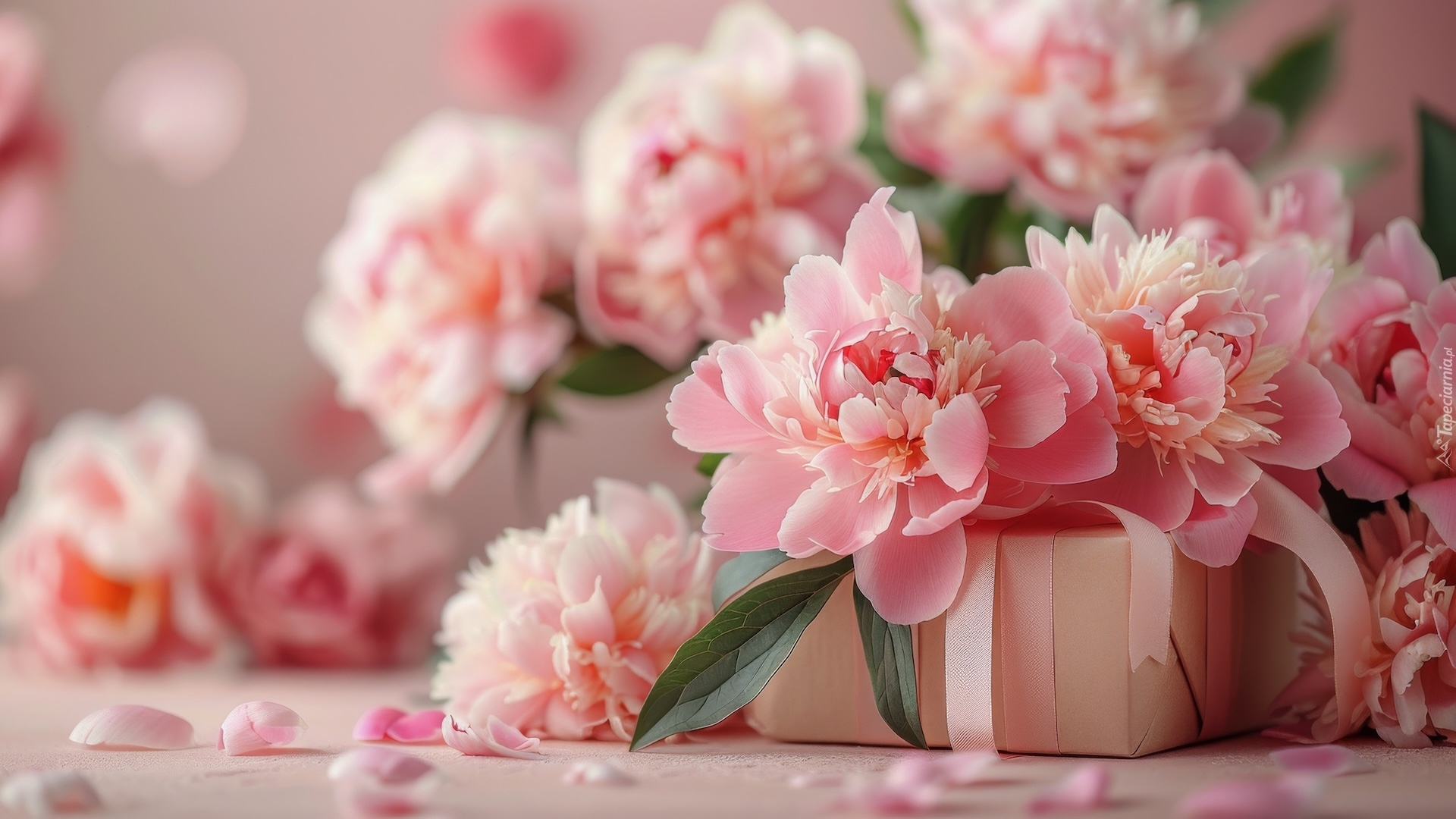 Edytor tapety: Różowe piwonie na prezencie i obok niego