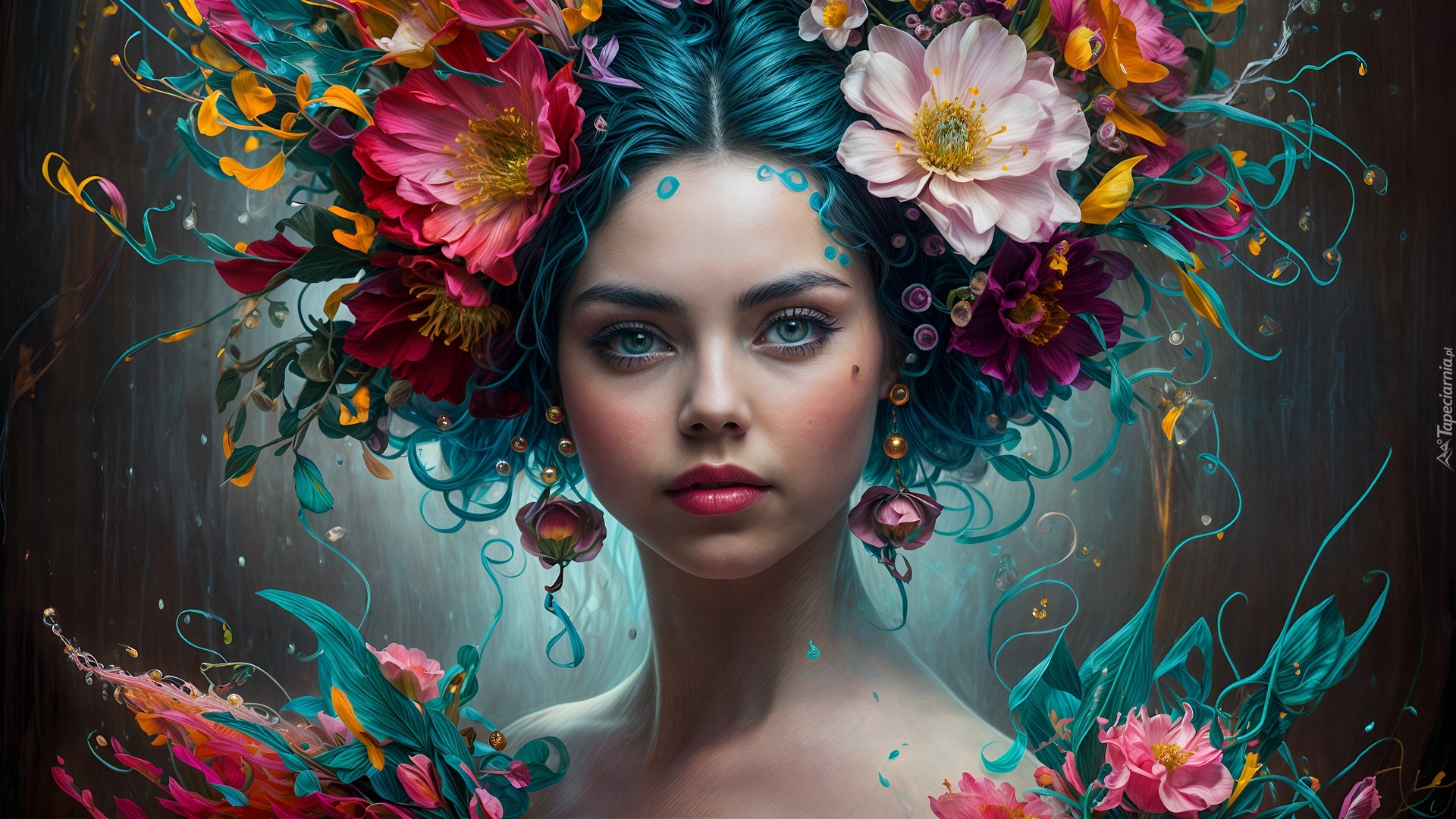 Edytor tapety: Twarz kobiety z kwiatami we włosach w 2D