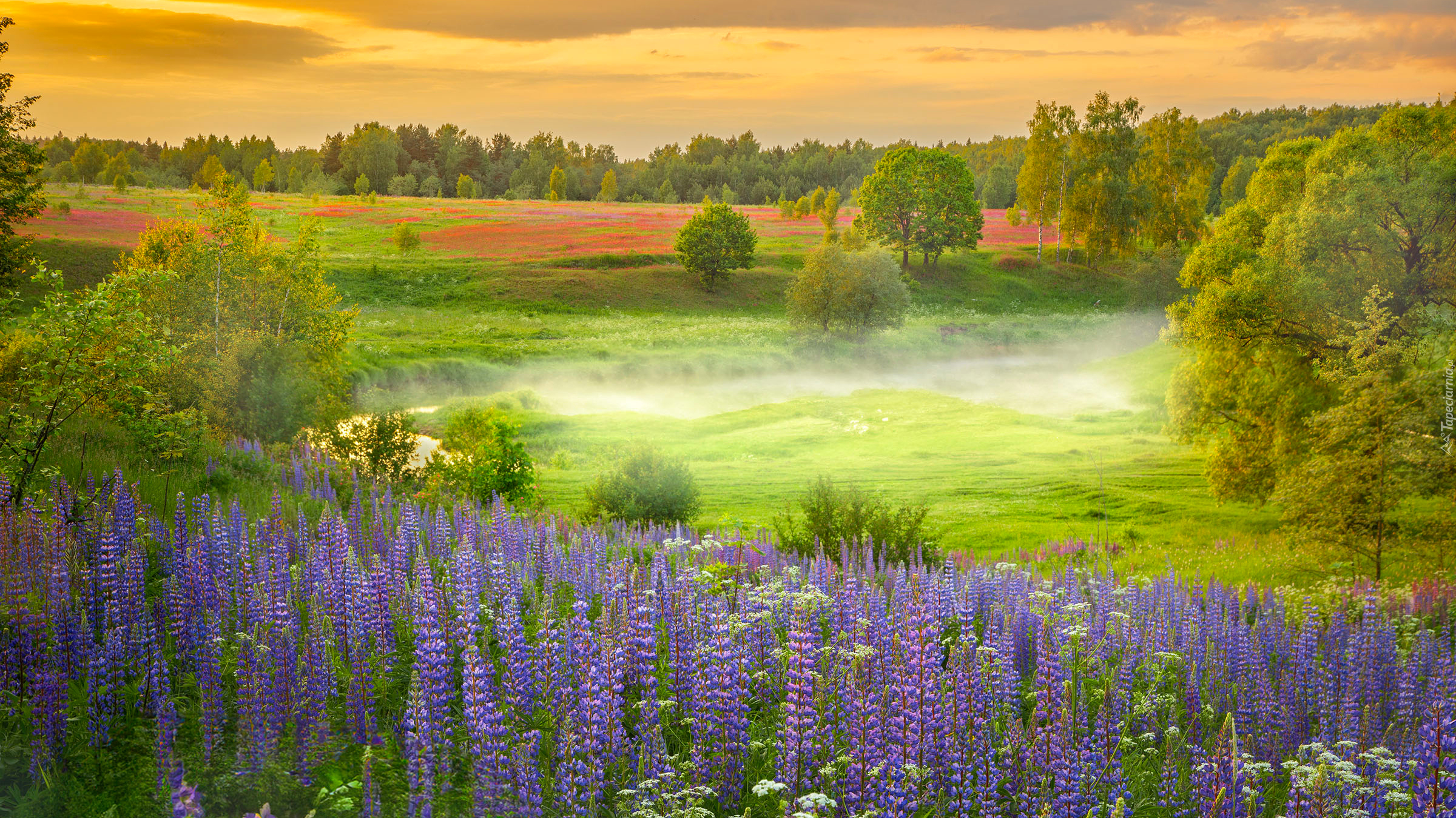 Edytor tapety: Łubin na łące i poranna mgła obok drzew
