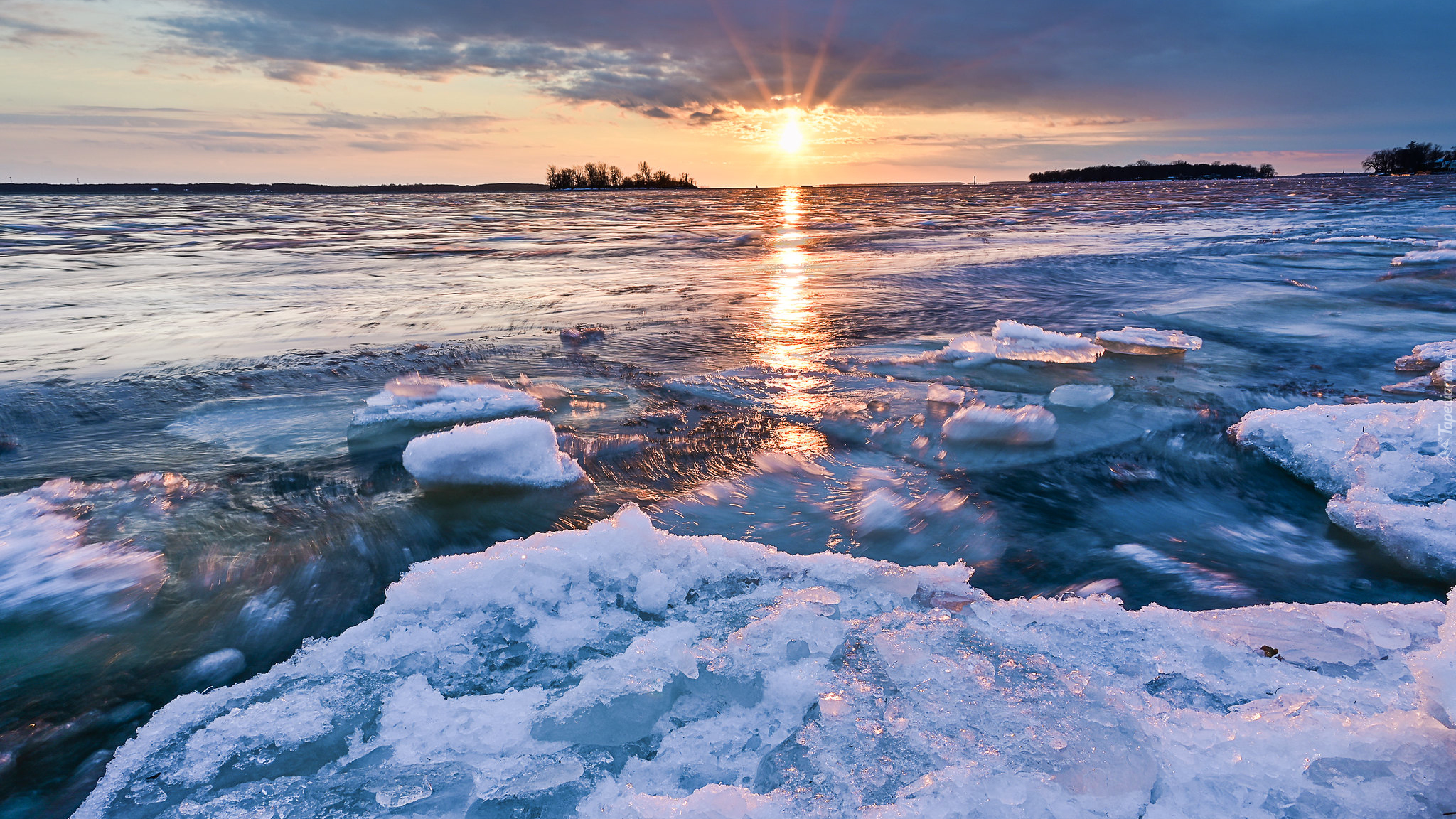 Edytor tapety: Lód na jeziorze w promieniach zachodzącego słońca
