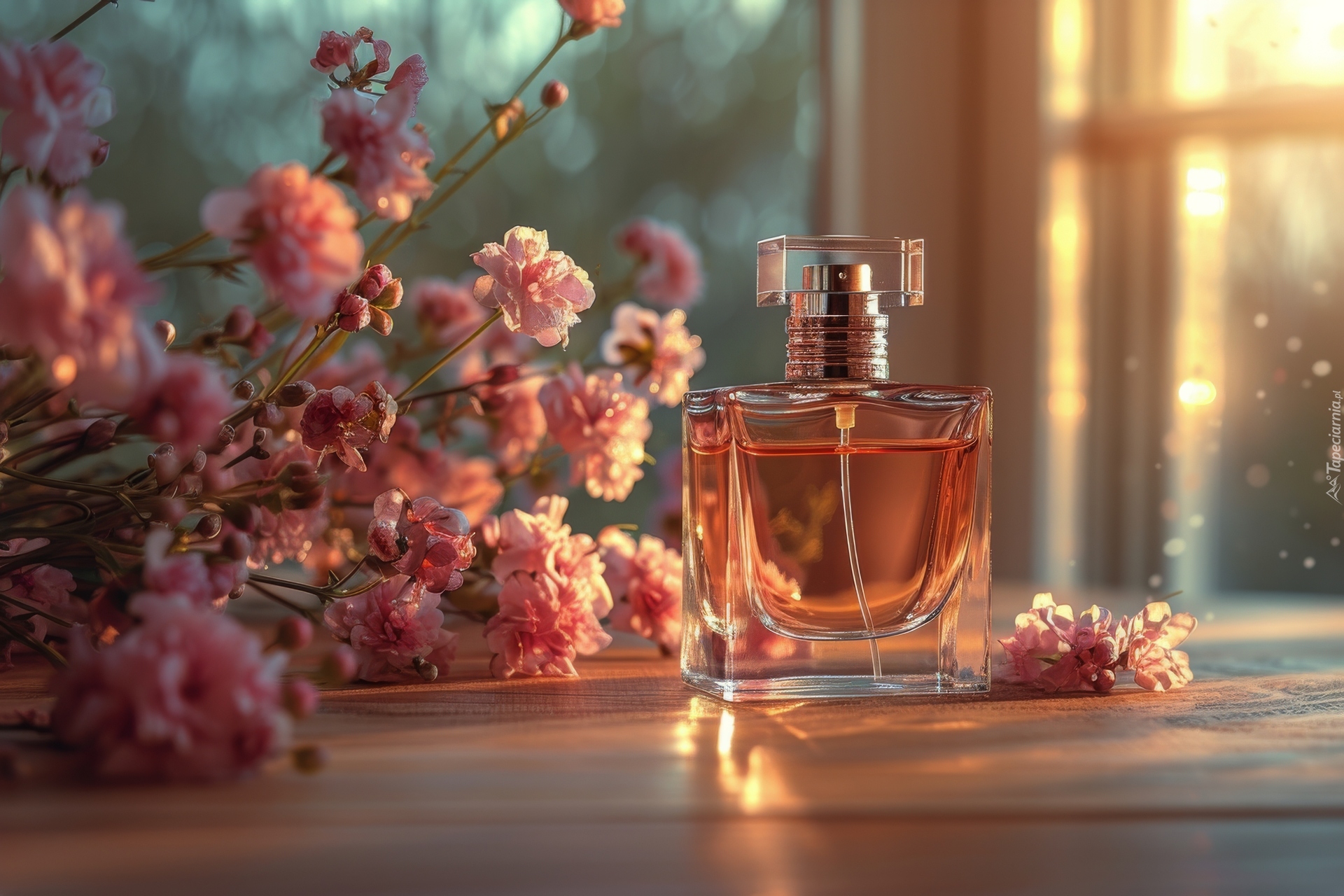Edytor tapety: Flakon z perfumami obok kwiatów w słonecznym świetle