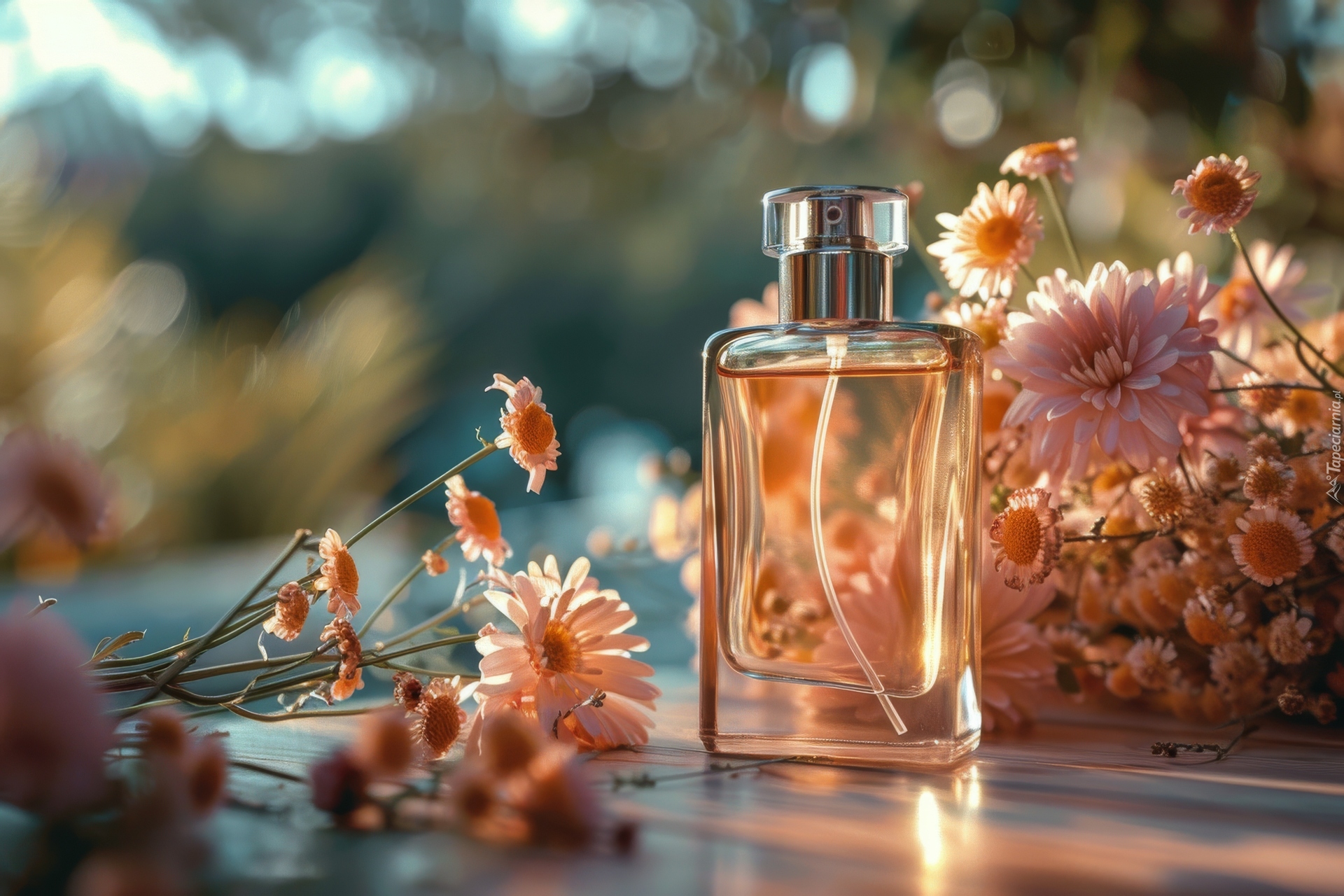 Edytor tapety: Rozświetlony światłem flakon z perfumami obok kwiatów