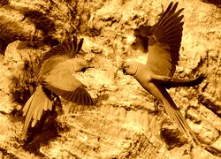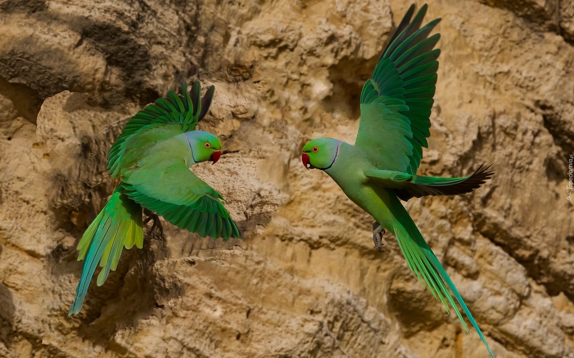 Edytor tapety: Dwie zielone aleksandretty obrożne na tle skał