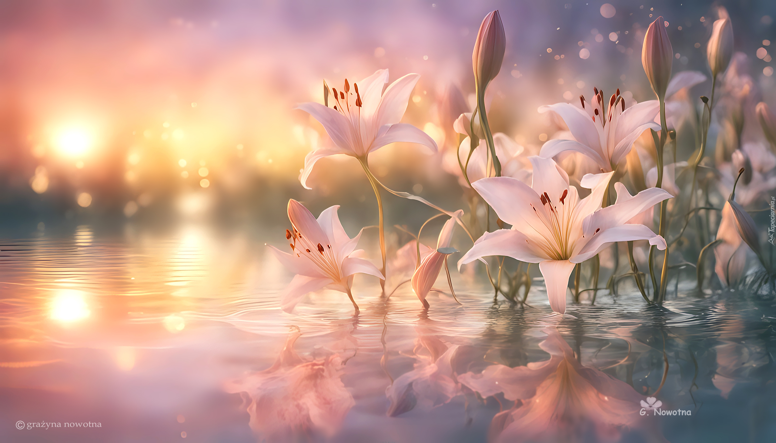 Edytor tapety: Białe lilie w wodzie na słonecznym rozmytym tle