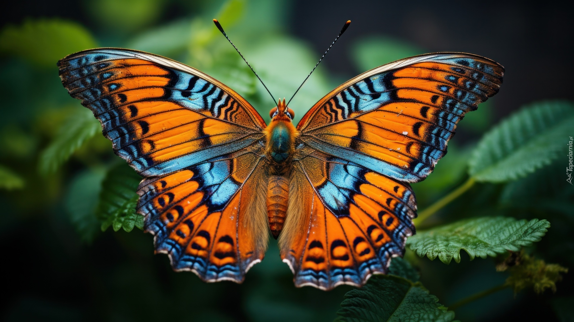 Edytor tapety: Pomarańczowo-niebieski motyl na liściach