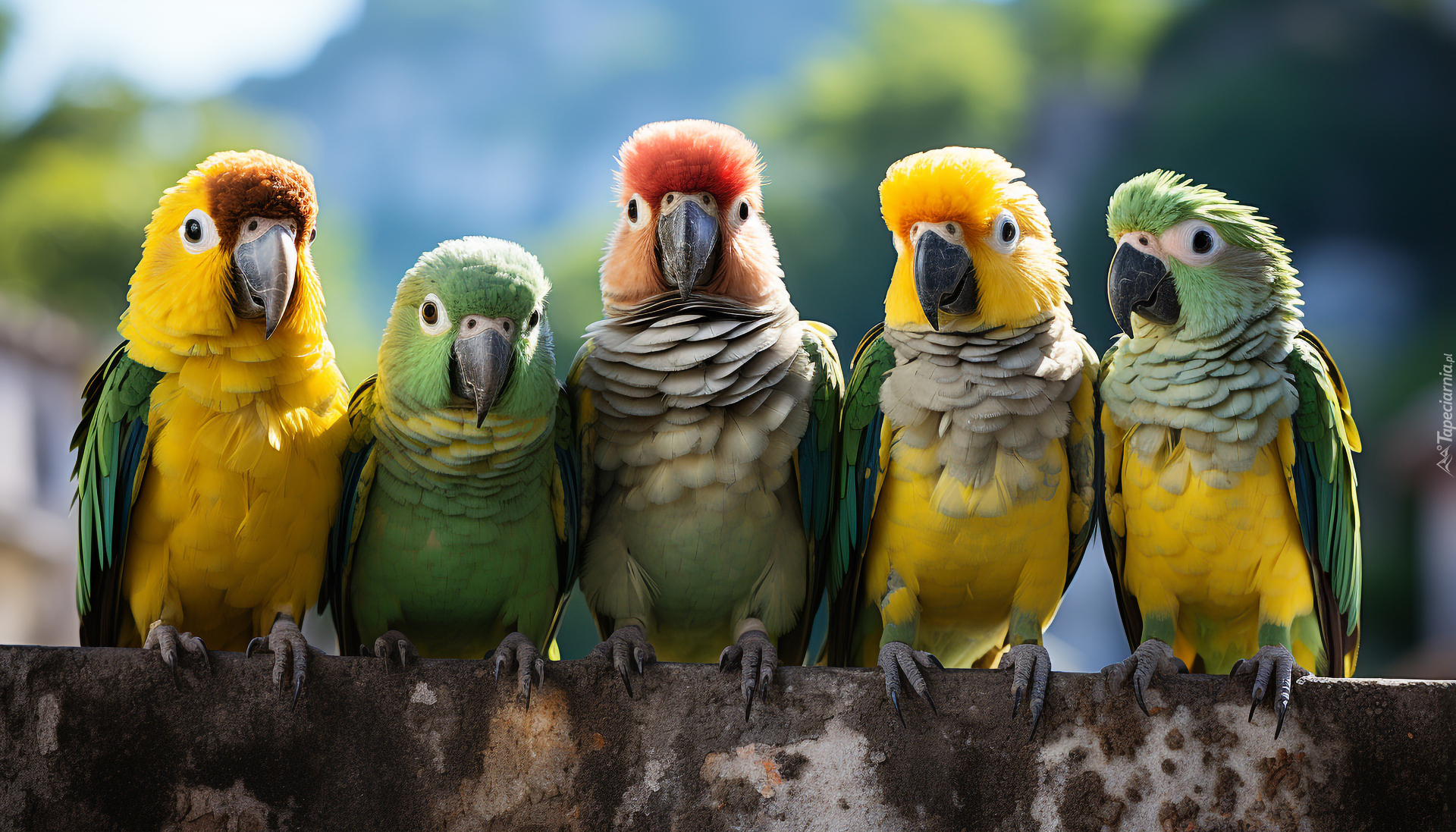 Edytor tapety: Papugi konury na poręczy