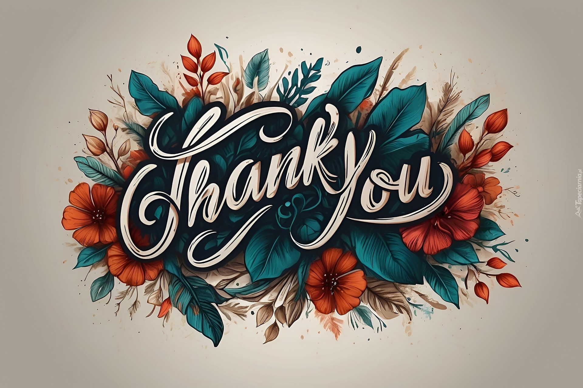 Edytor tapety: Napis thank you na liściach z kwiatami