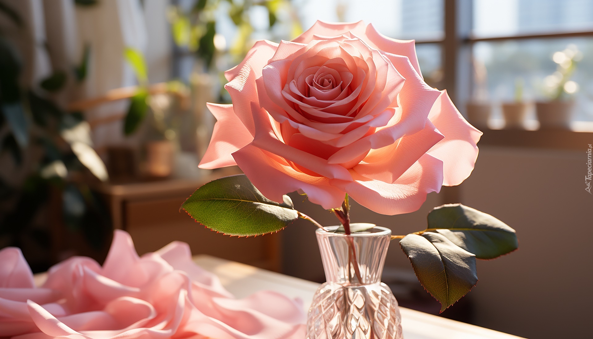 Edytor tapety: Rozświetlona i rozkwitnięta różowa róża w szklanym wazonie