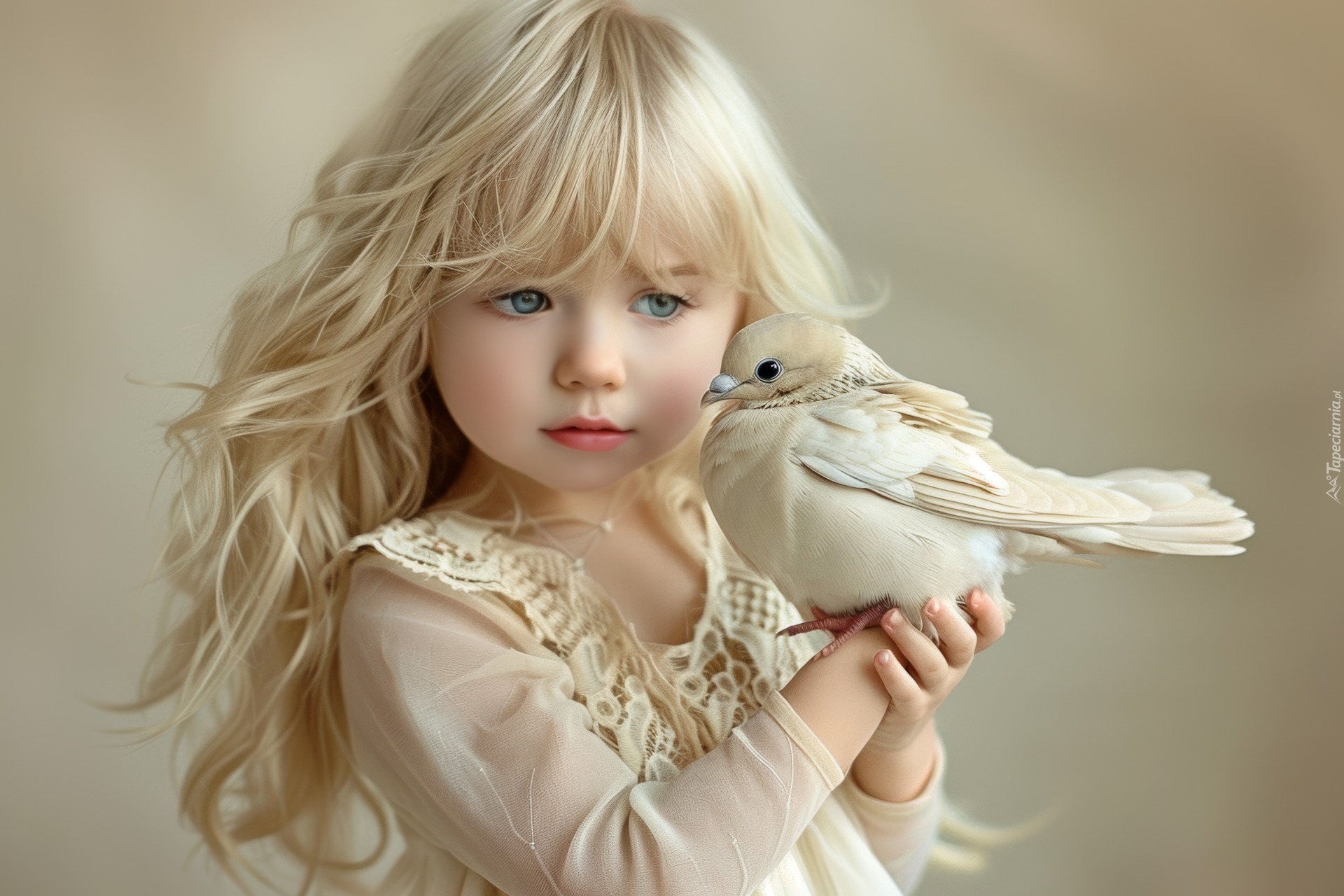 Edytor tapety: Dziewczynka z białym ptakiem w dłoniach