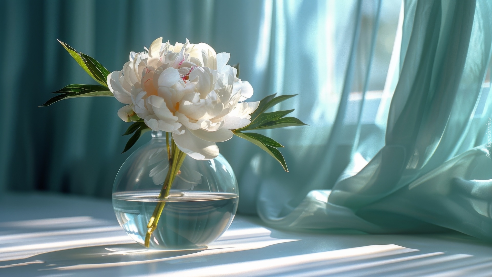 Edytor tapety: Biała piwonia w wazonie obok okna z firanką