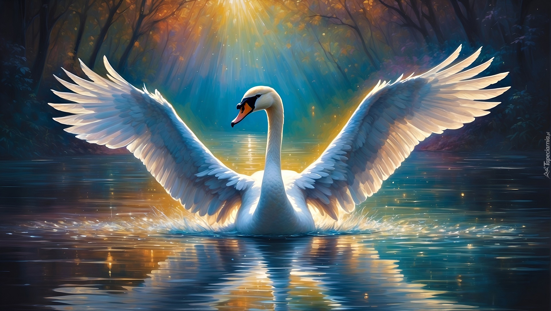 Edytor tapety: Odbicie łabędzia w wodzie z rozpostartymi skrzydłami