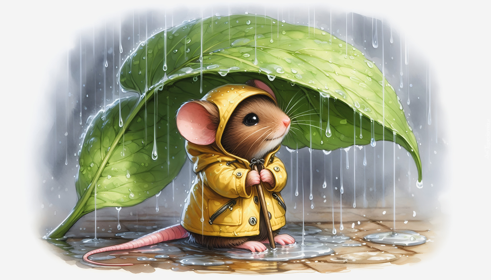Edytor tapety: Myszka schowana przed deszczem pod liściem