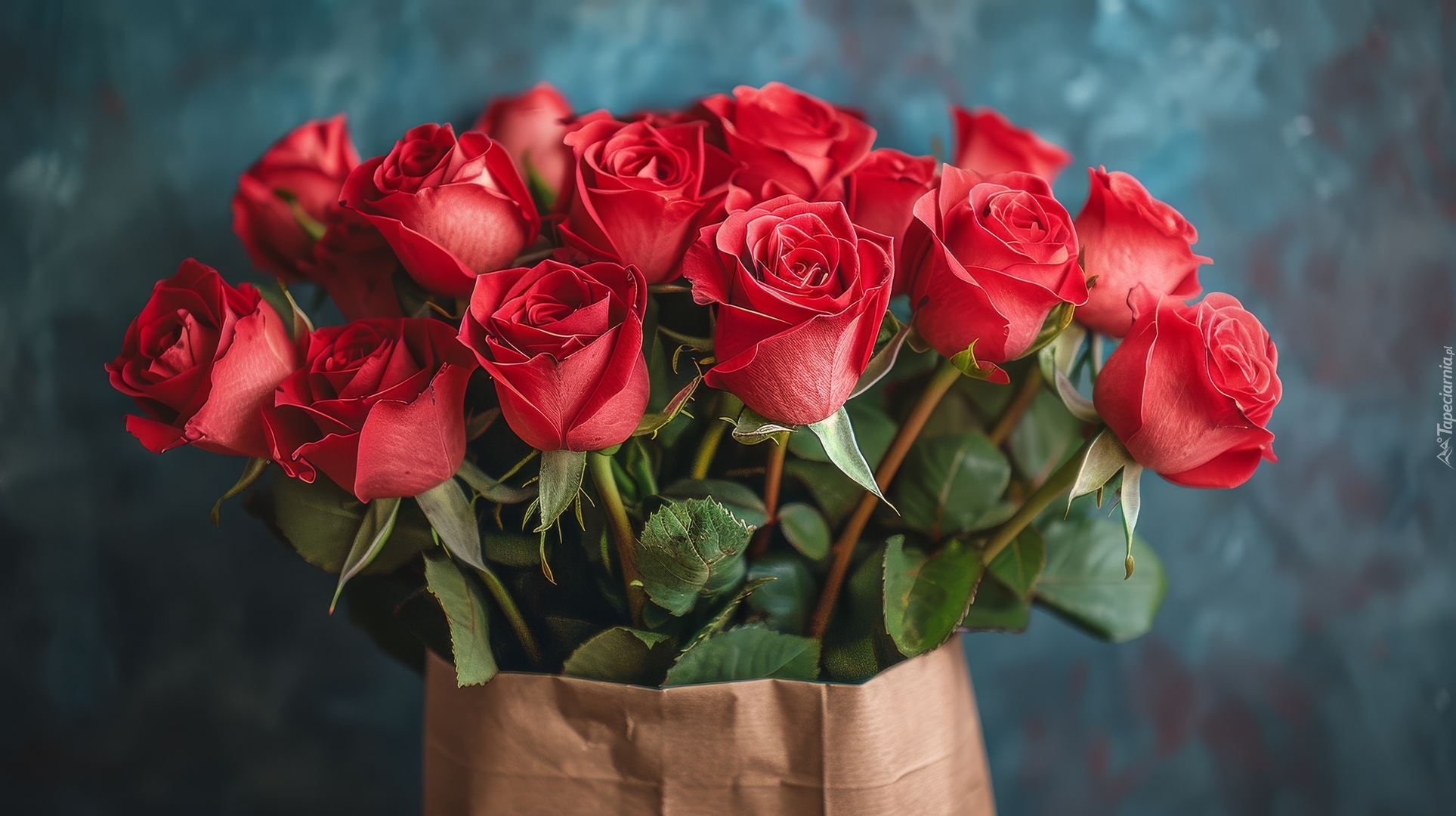 Edytor tapety: Bukiet czerwonych róż w papierowej torbie