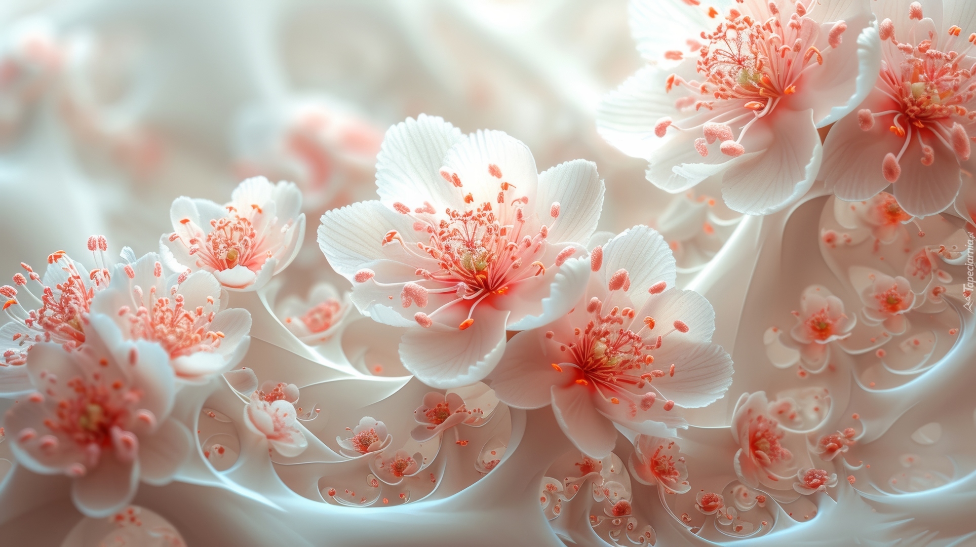 Edytor tapety: Rozwinięte białe kwiaty z pomarańczowymi pręcikami