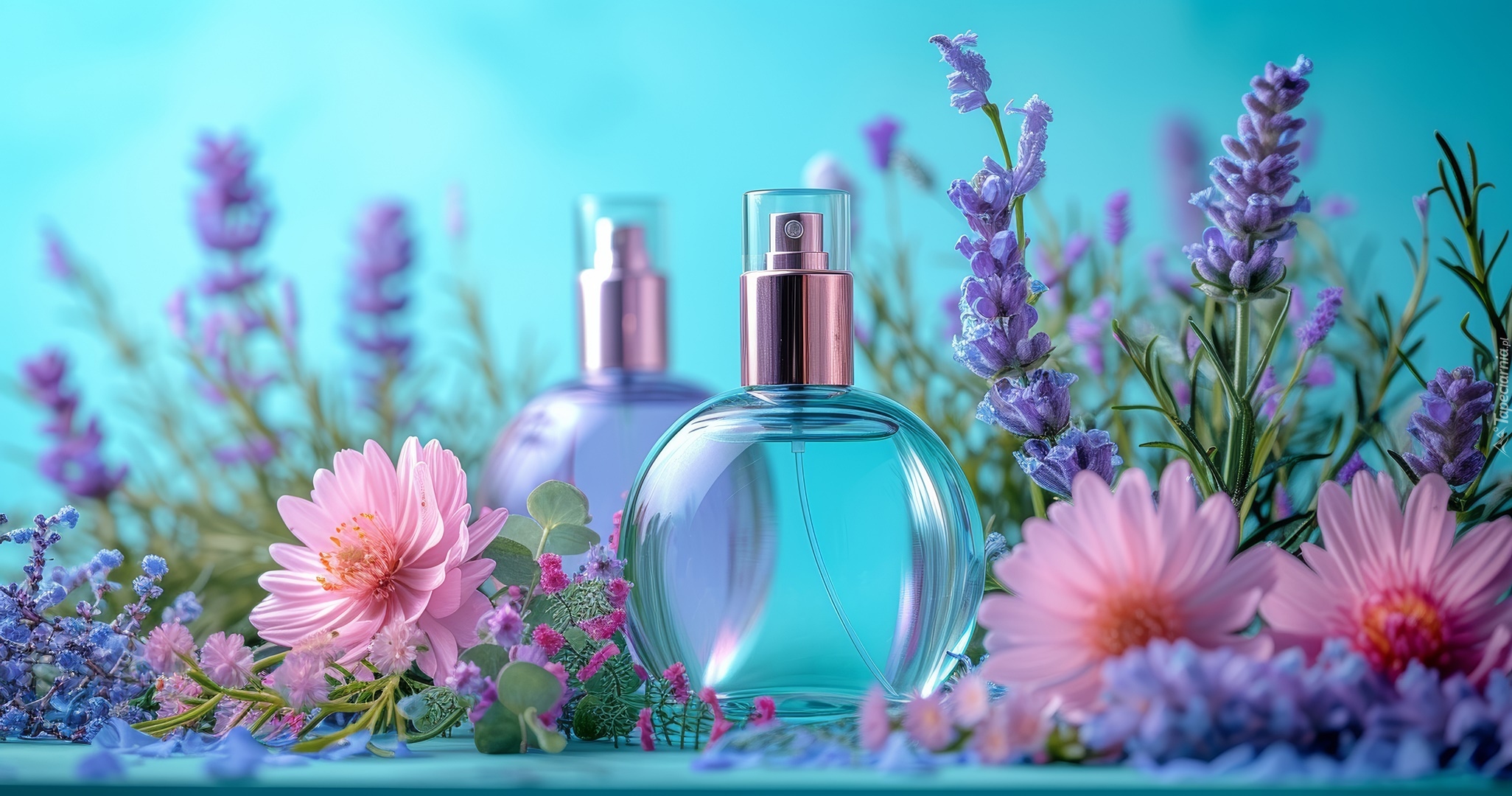 Edytor tapety: Flakony z perfumami wśród kwiatów