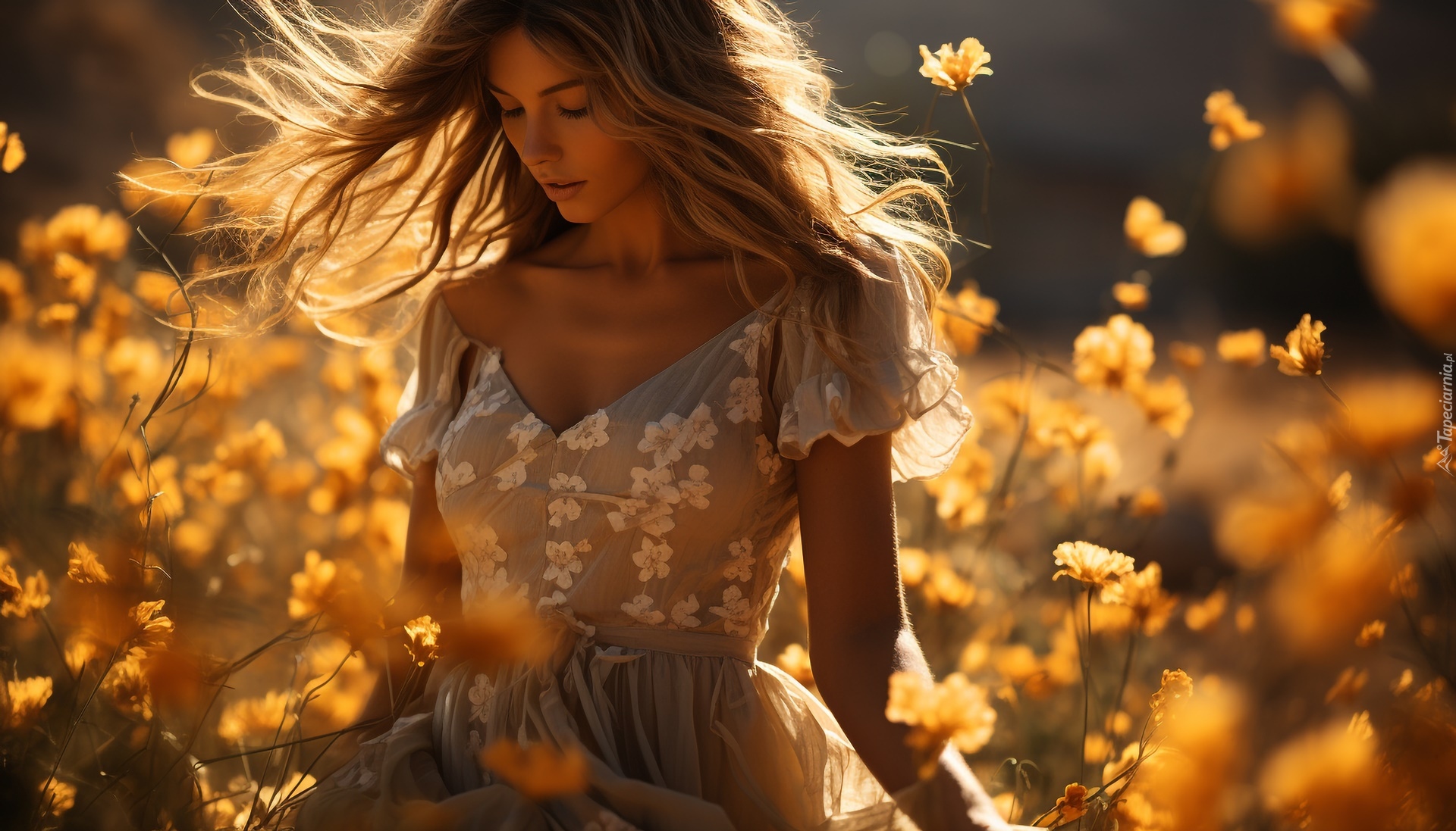 Edytor tapety: Długowłosa blondynka w sukience na rozświetlonej słońcem łące