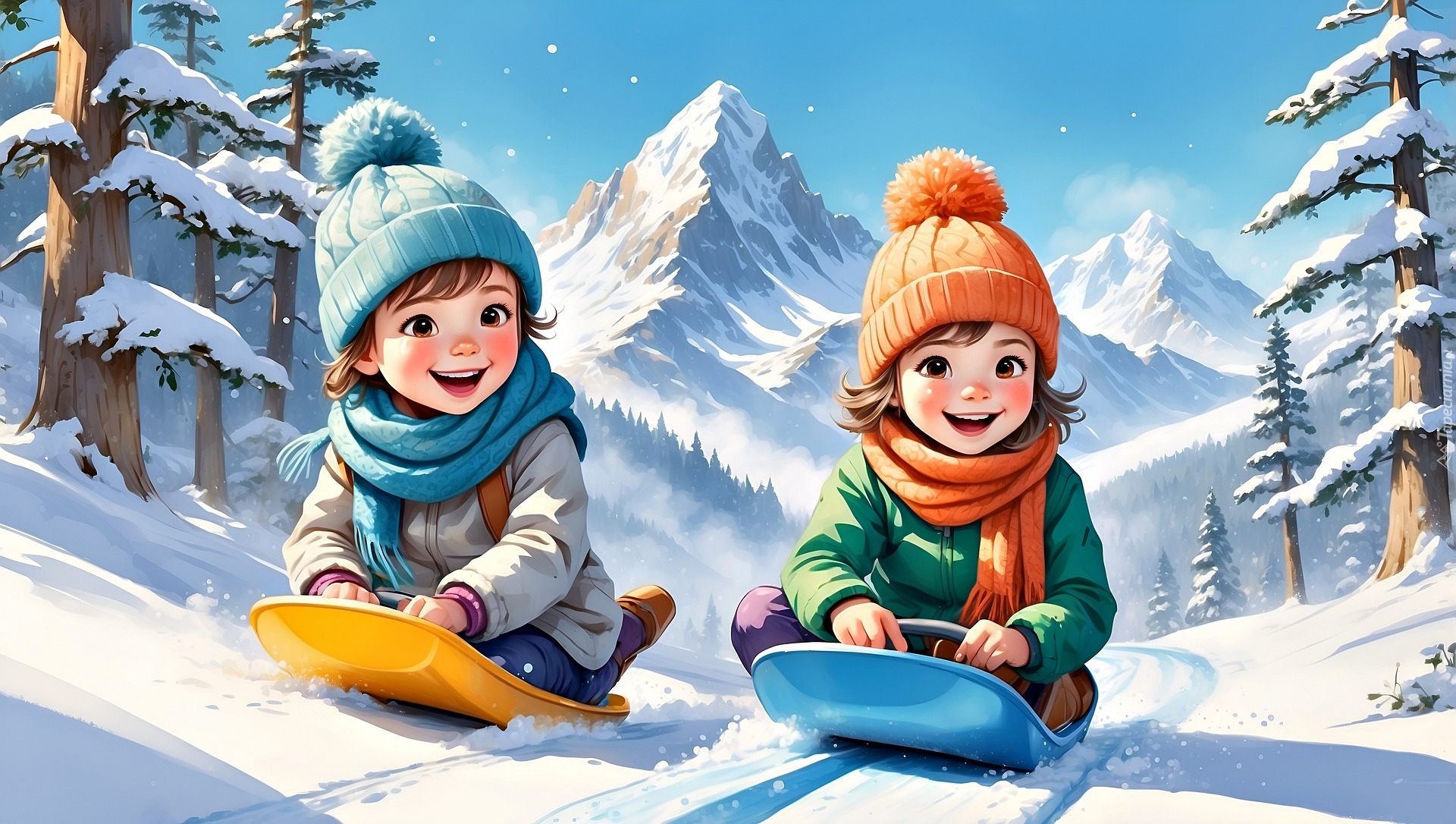 Edytor tapety: Uśmiechnięte dzieci na sankach na tle ośnieżonych gór