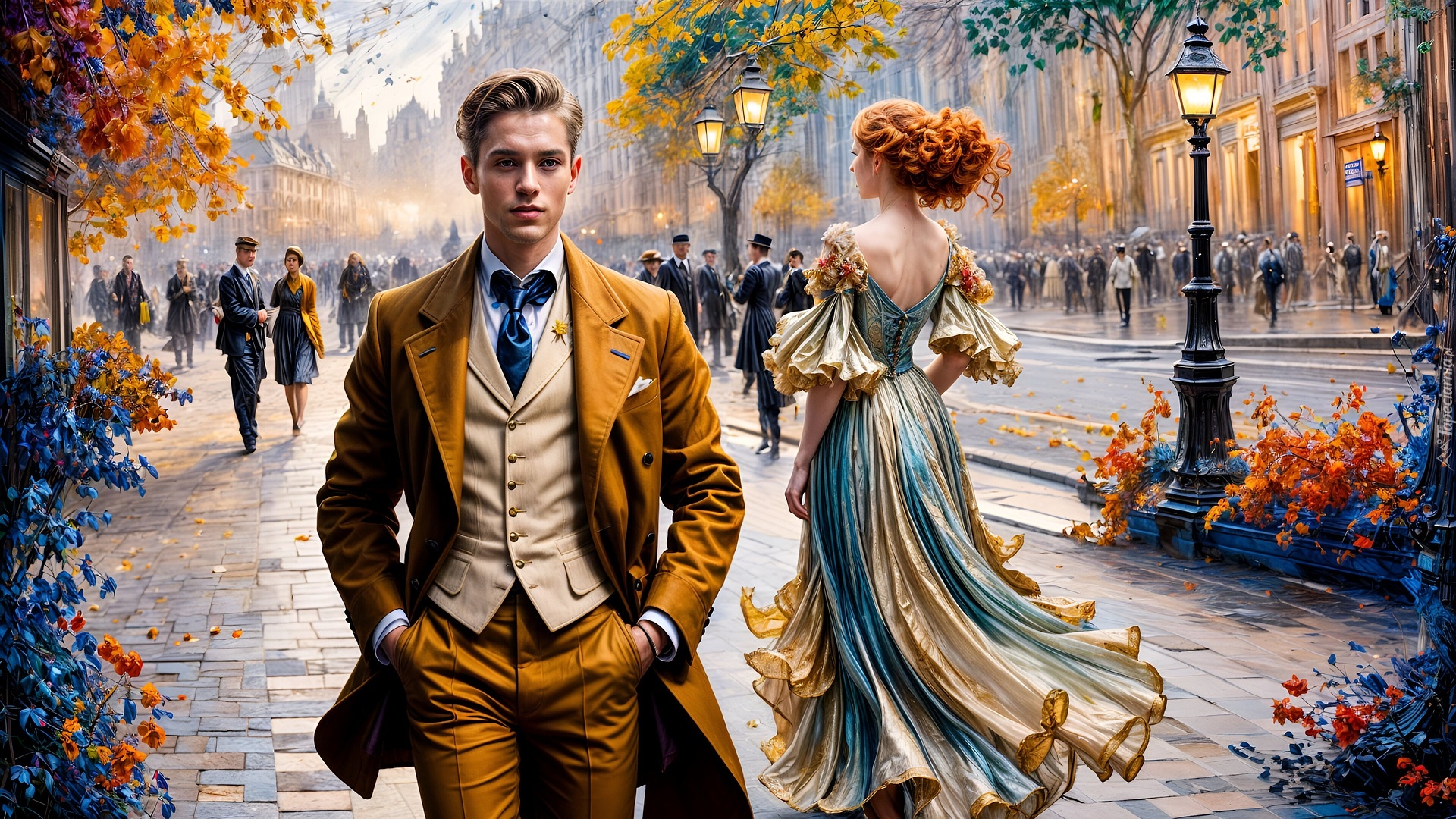 Edytor tapety: Rudowłosa kobieta i mężczyzna w garniturze na ulicy