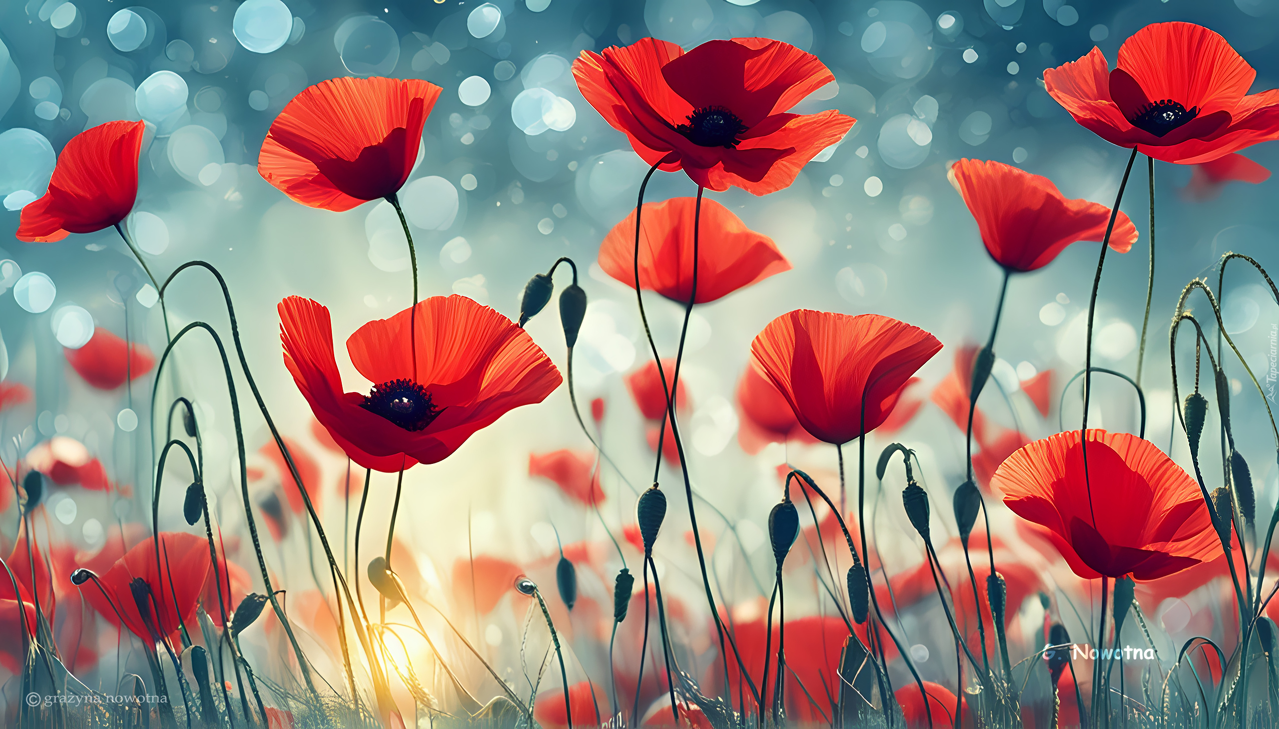 Edytor tapety: Rozświetlone czerwone maki z pąkami na rozmytym tle