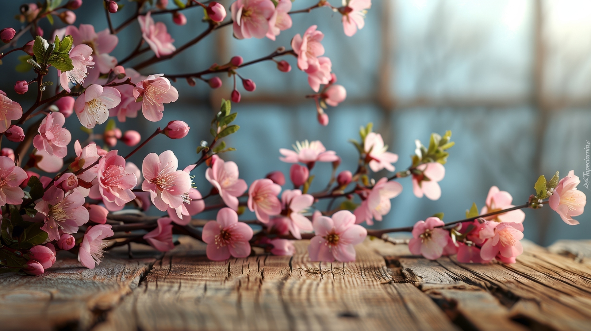 Edytor tapety: Gałązka z różowymi kwiatami drzewa owocowego na deskach