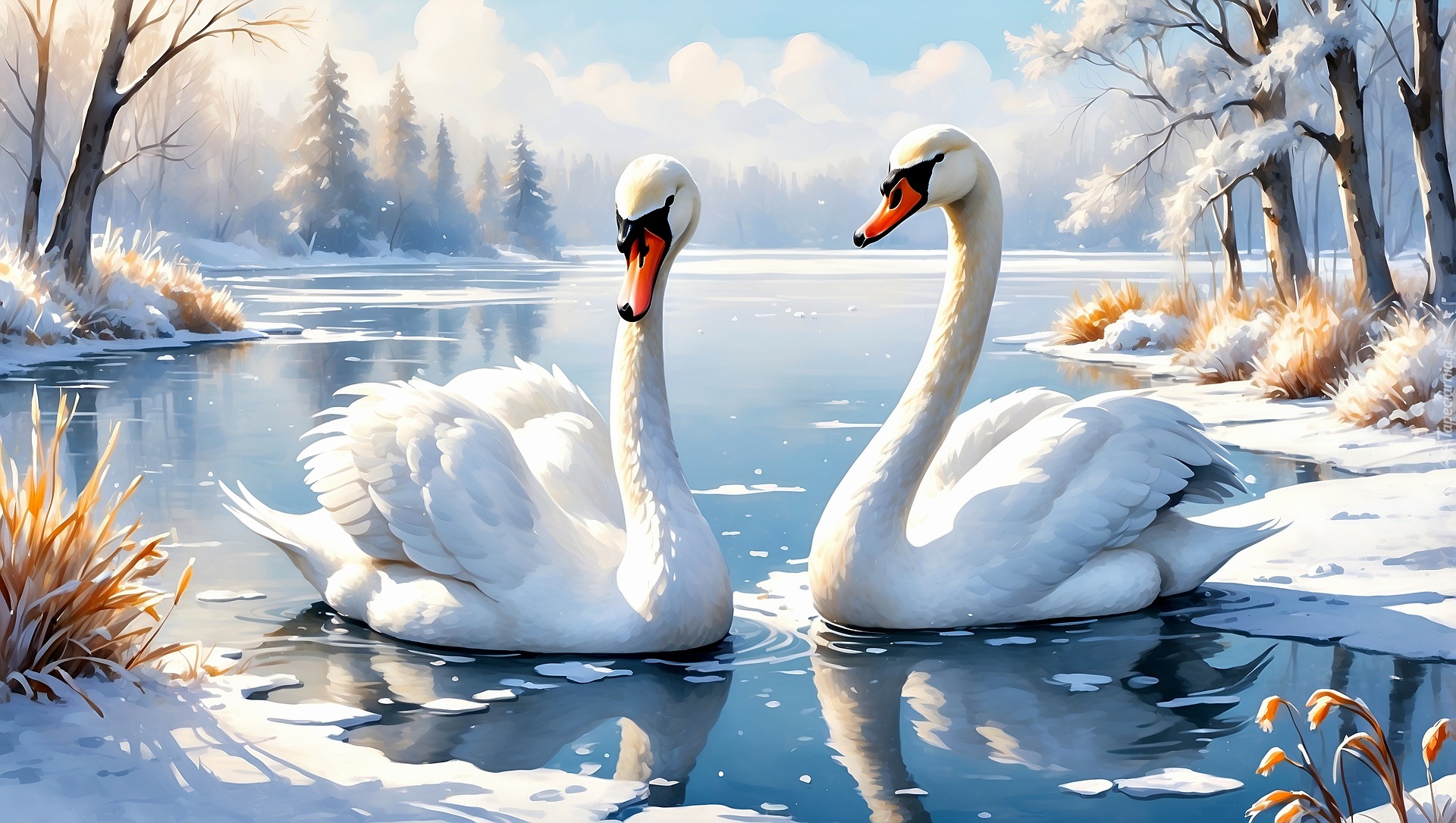 Edytor tapety: Dwa łabędzie na jeziorze zimową porą