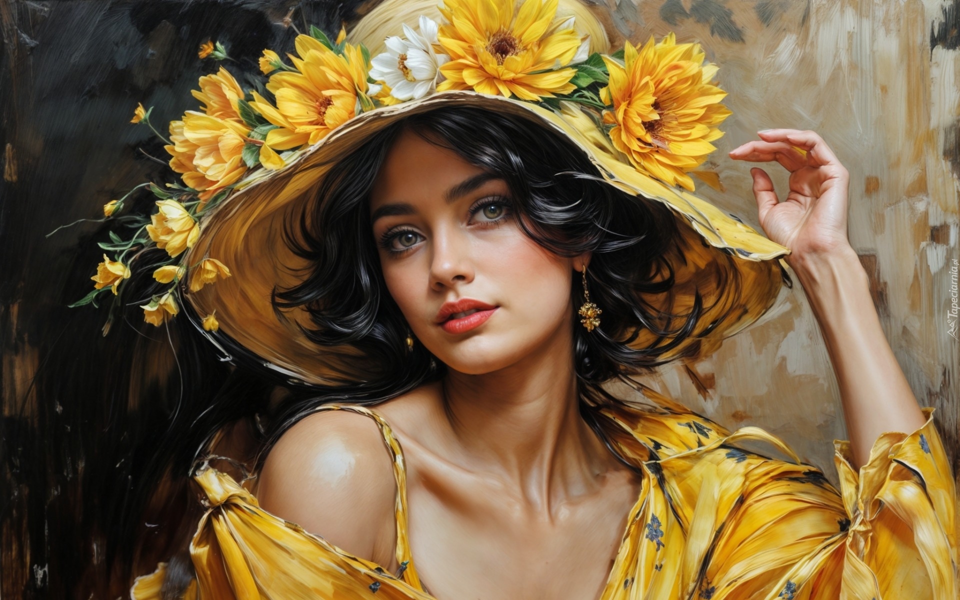 Edytor tapety: Dziewczyna w sukience i żółtym kapeluszu z kwiatami