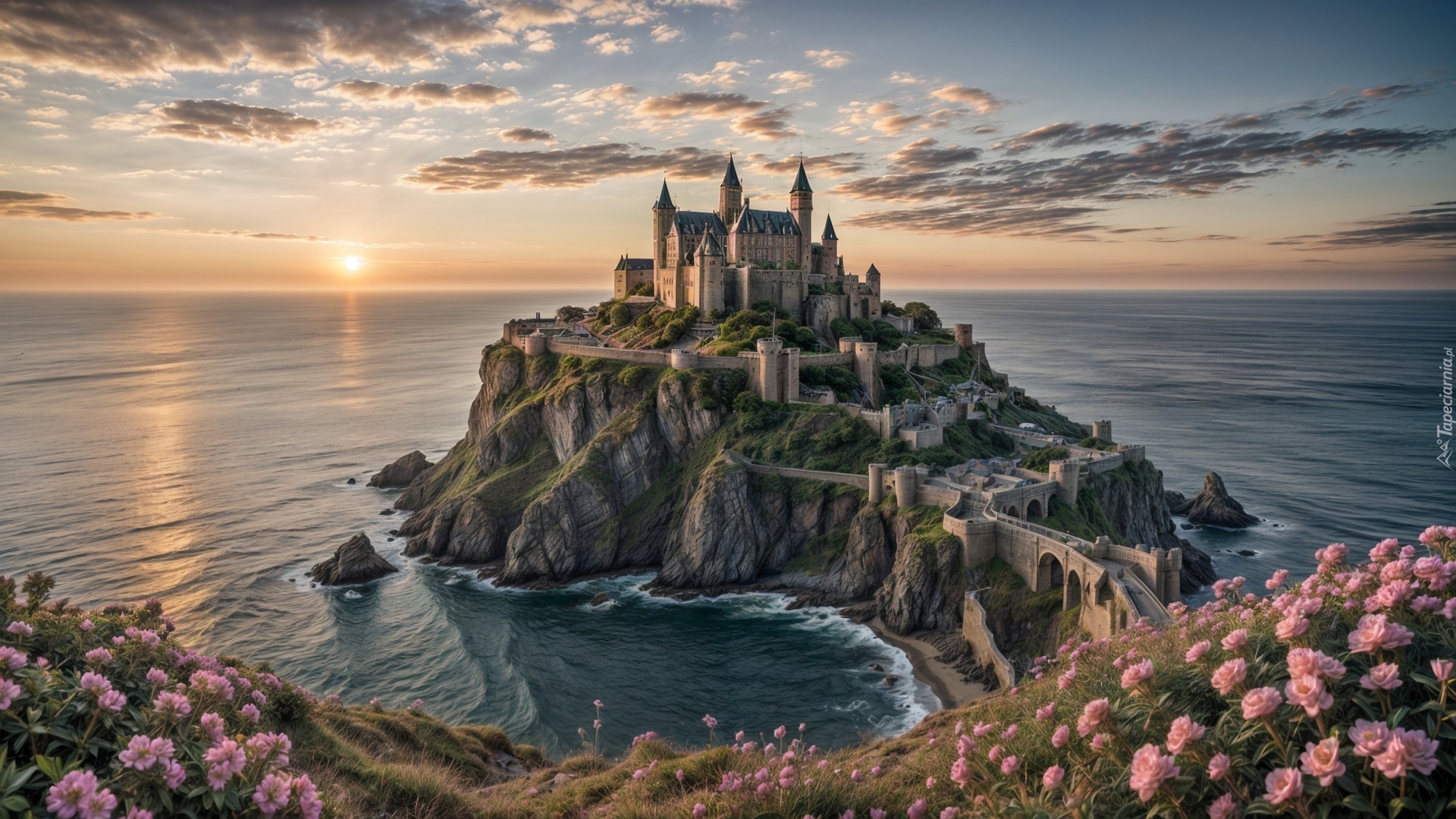 Edytor tapety: Zamek na skale na morzu o zachodzie słońca