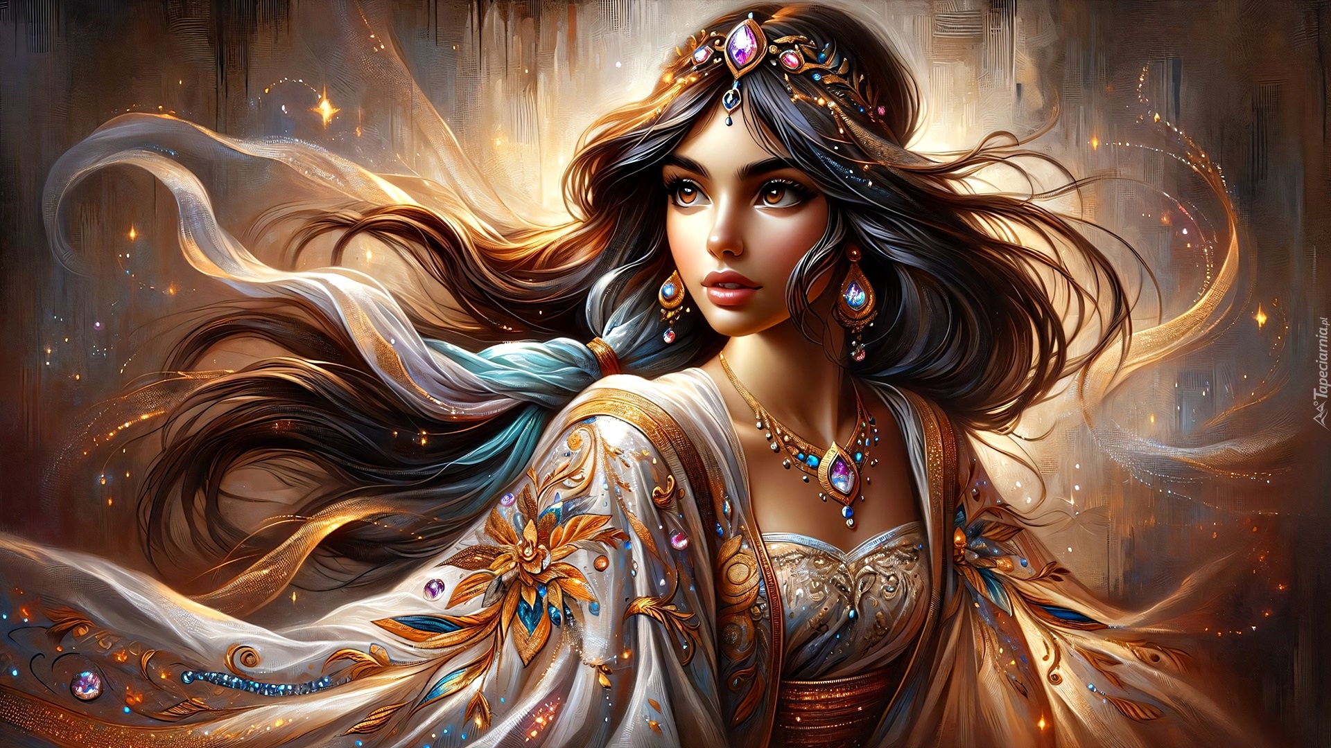 Edytor tapety: Długowłosa księżniczka w kolorowej sukni i biżuterii