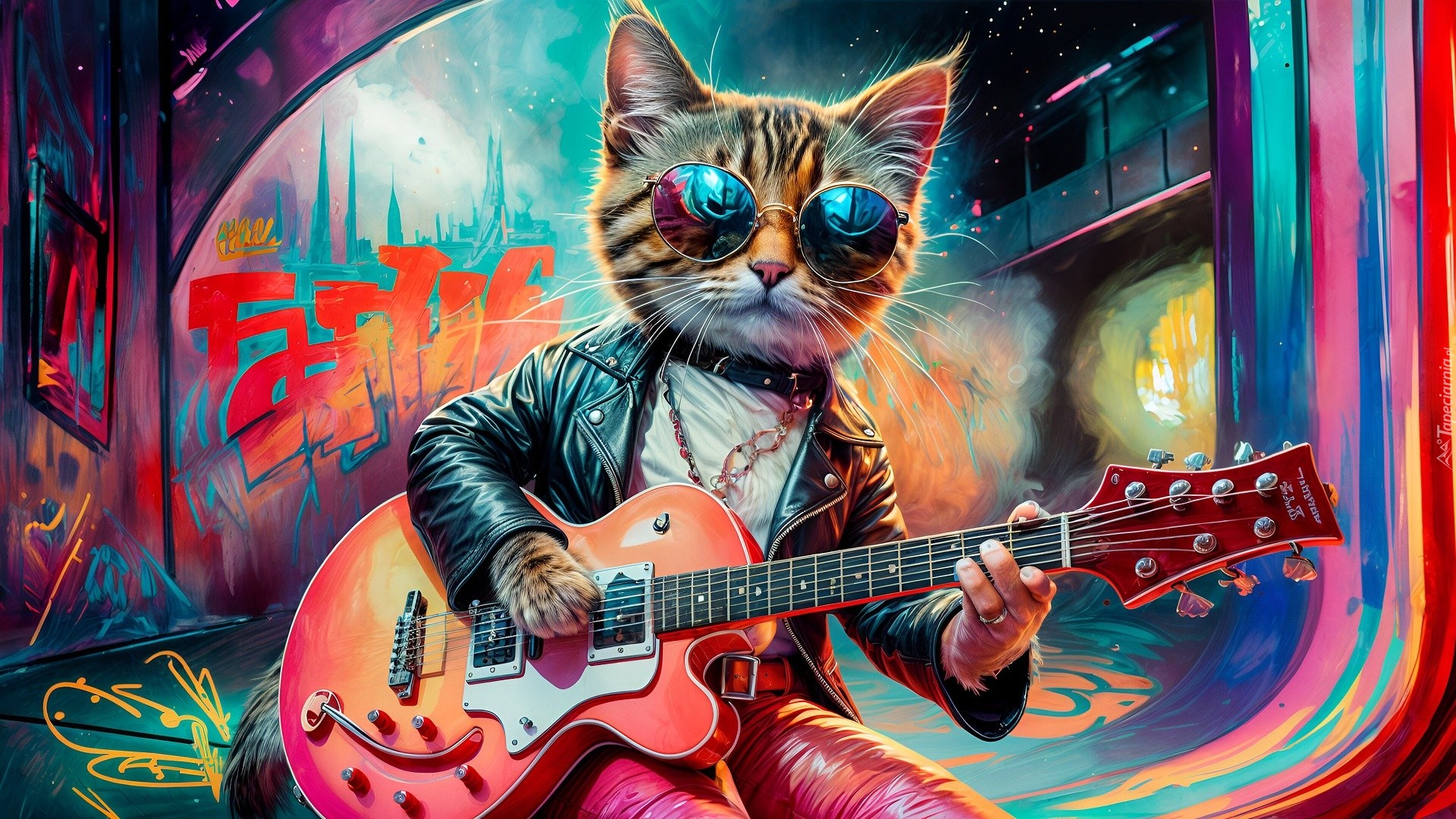 Edytor tapety: Kolorowa grafika z kotem grającym na gitarze