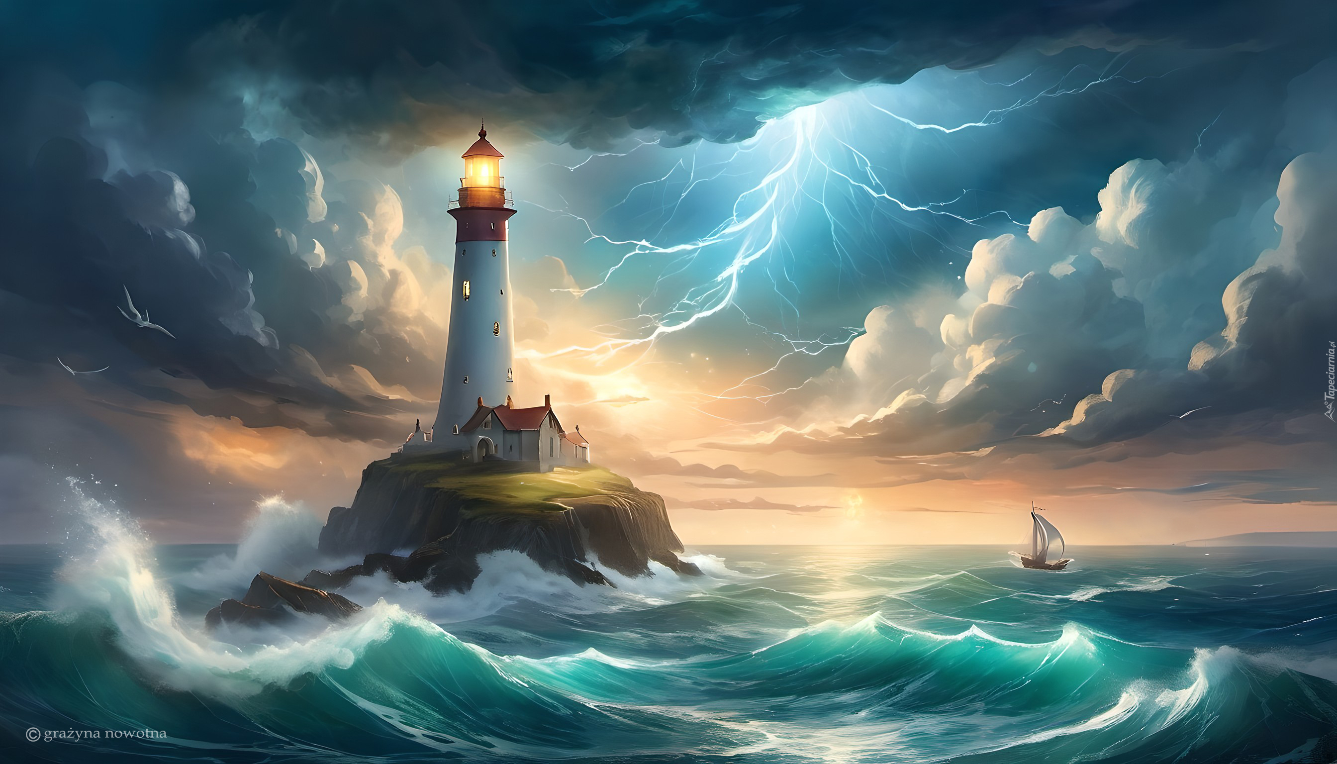 Edytor tapety: Żaglówka i latarnia morska podczas burzy na morzu