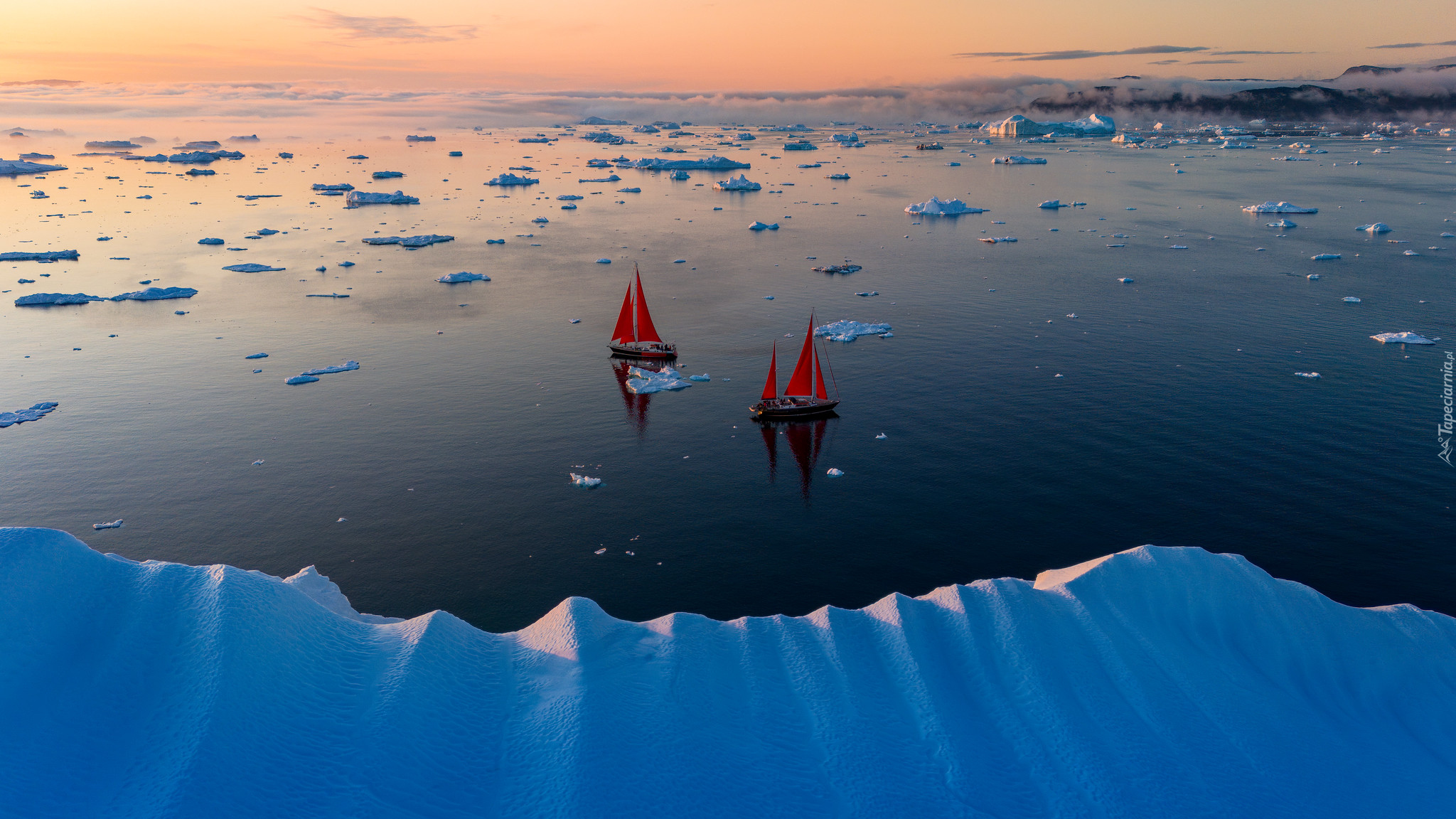 Edytor tapety: Czerwone żaglówki obok góry lodowej na morzu