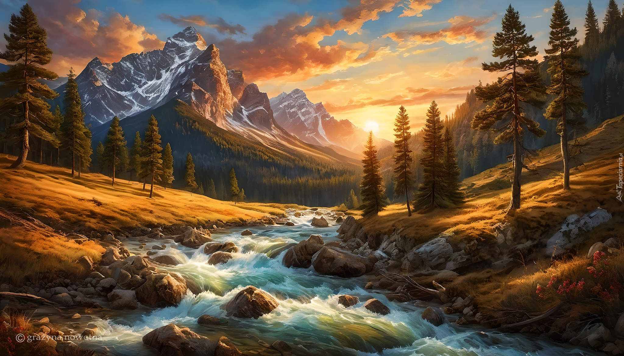 Edytor tapety: Rwący strumień na tle zachodu słońca w górach