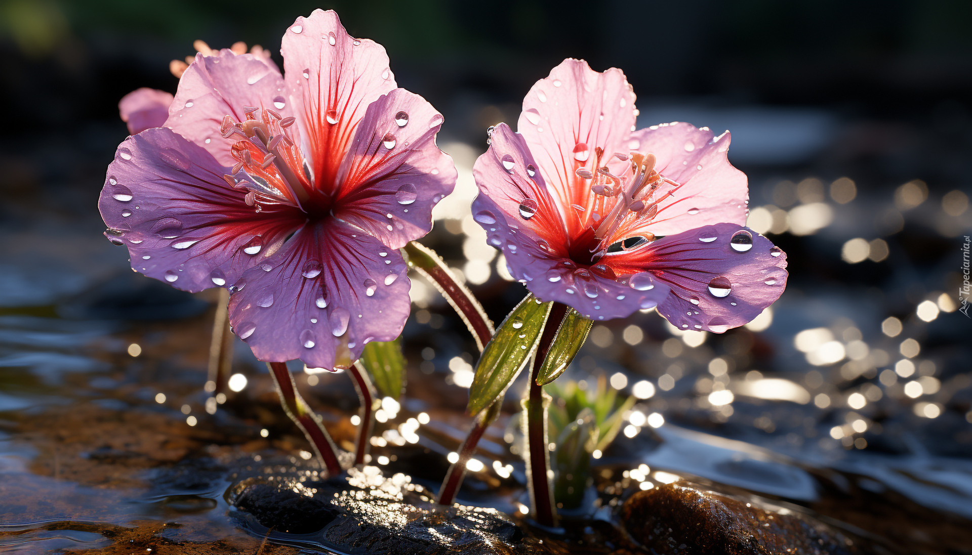 Edytor tapety: Rozświetlone i rozkwitnięte dwa różowe kwiaty w kroplach