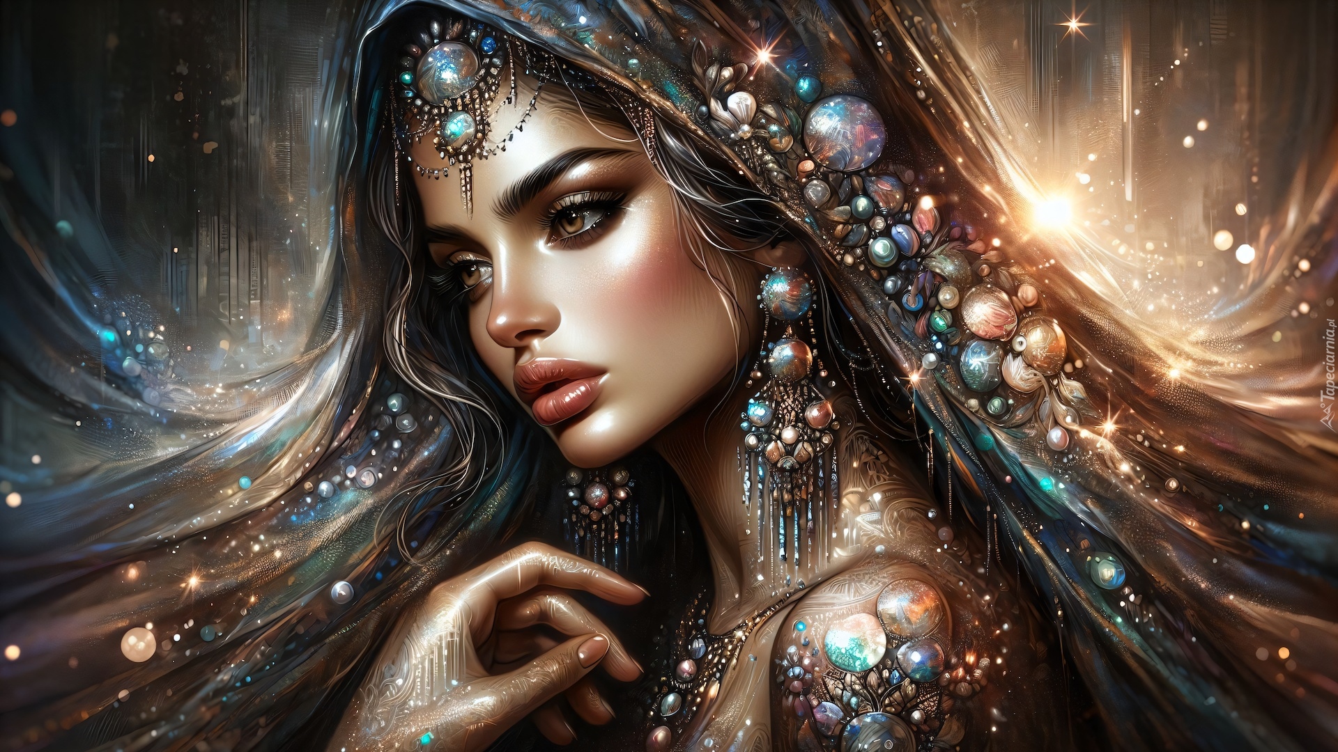 Edytor tapety: Długowłosa kobieta z biżuterią w grafice