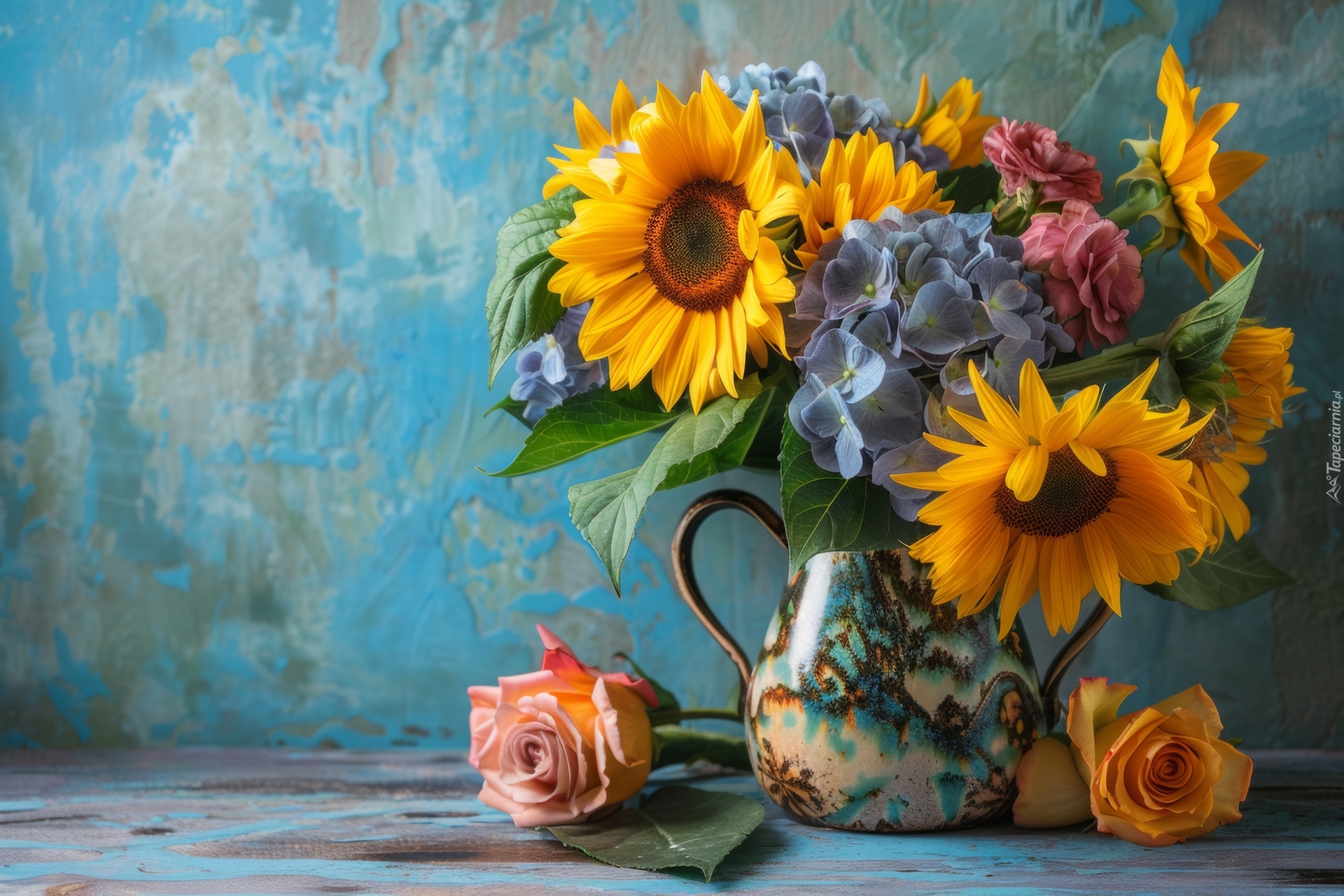 Edytor tapety: Hortensje i słoneczniki w dzbanku obok róż