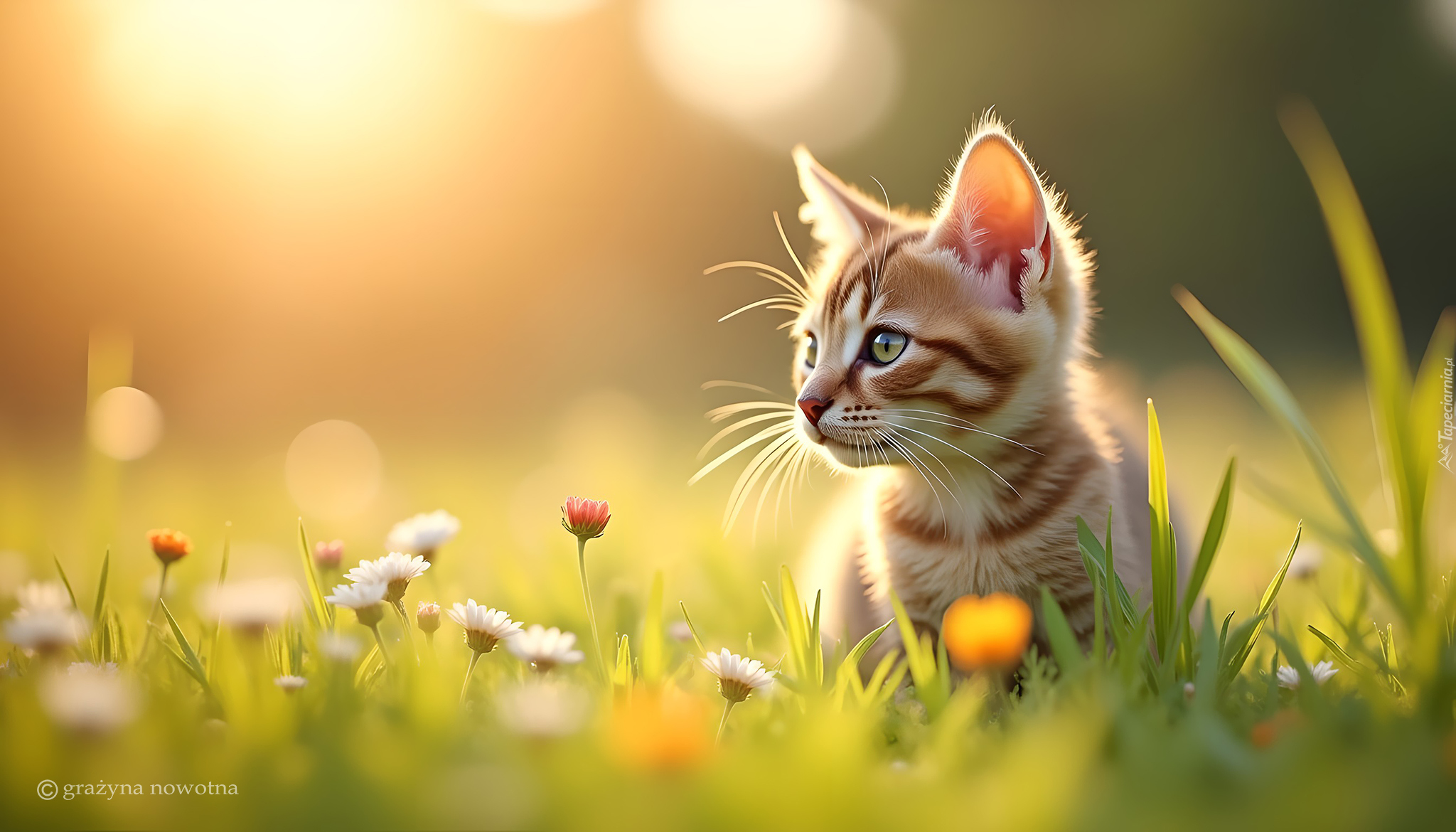 Edytor tapety: Rudawy mały kotek i kwiatki na słonecznej łące
