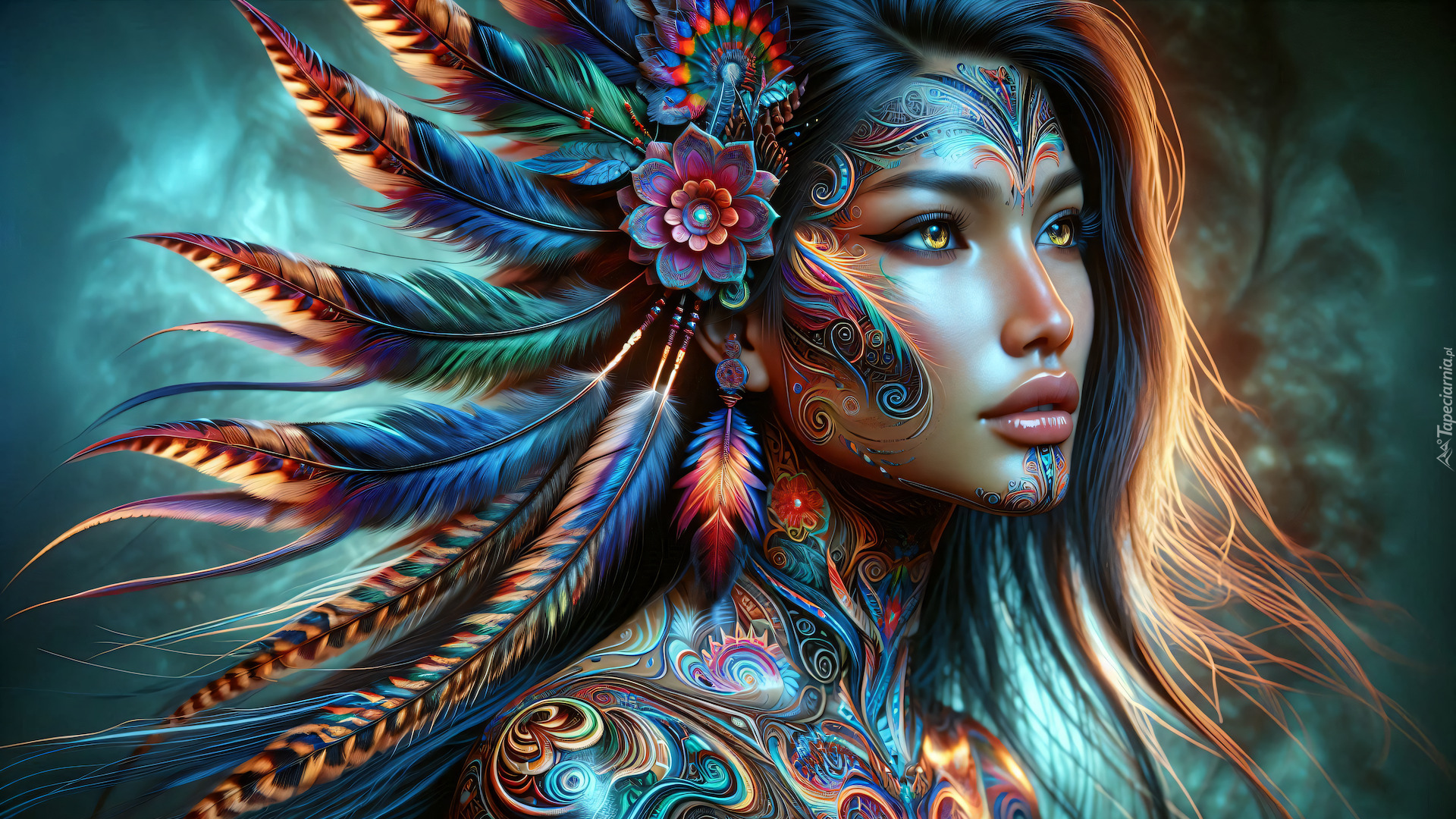 Edytor tapety: Długowłosa kobieta z kolorowym tatuażem w pióropuszu