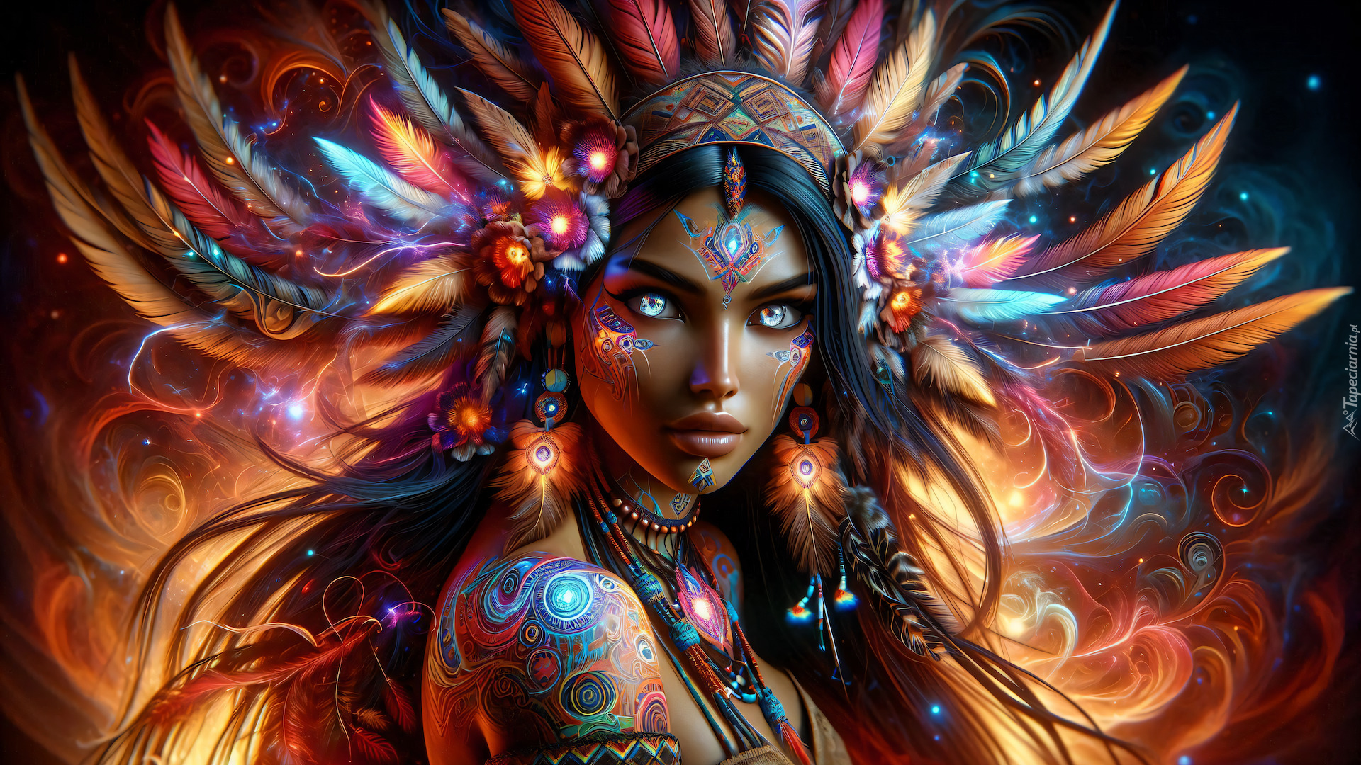 Edytor tapety: Grafika kobiety z tatuażem i kolorowymi piórami