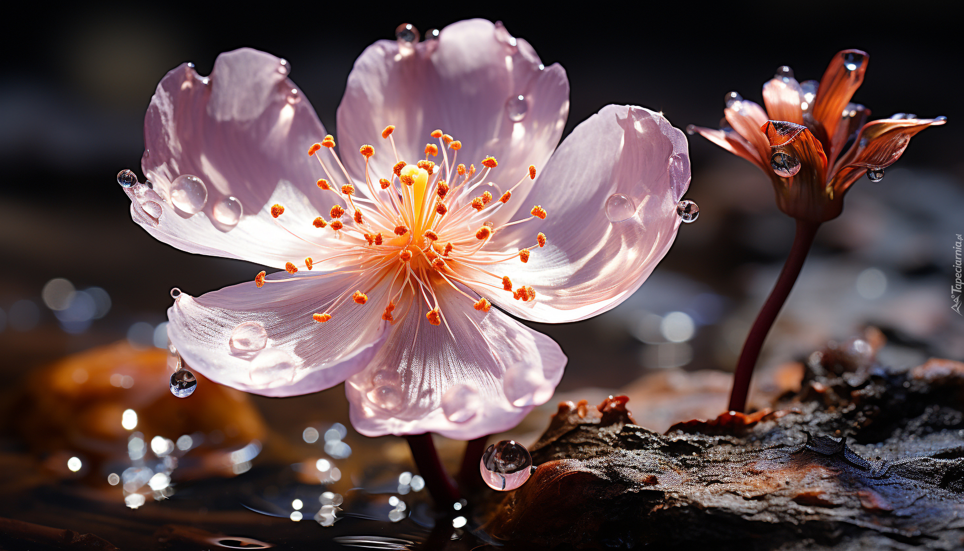 Edytor tapety: Jasnoróżowy rozwinięty kwiat z pręcikami i kroplami