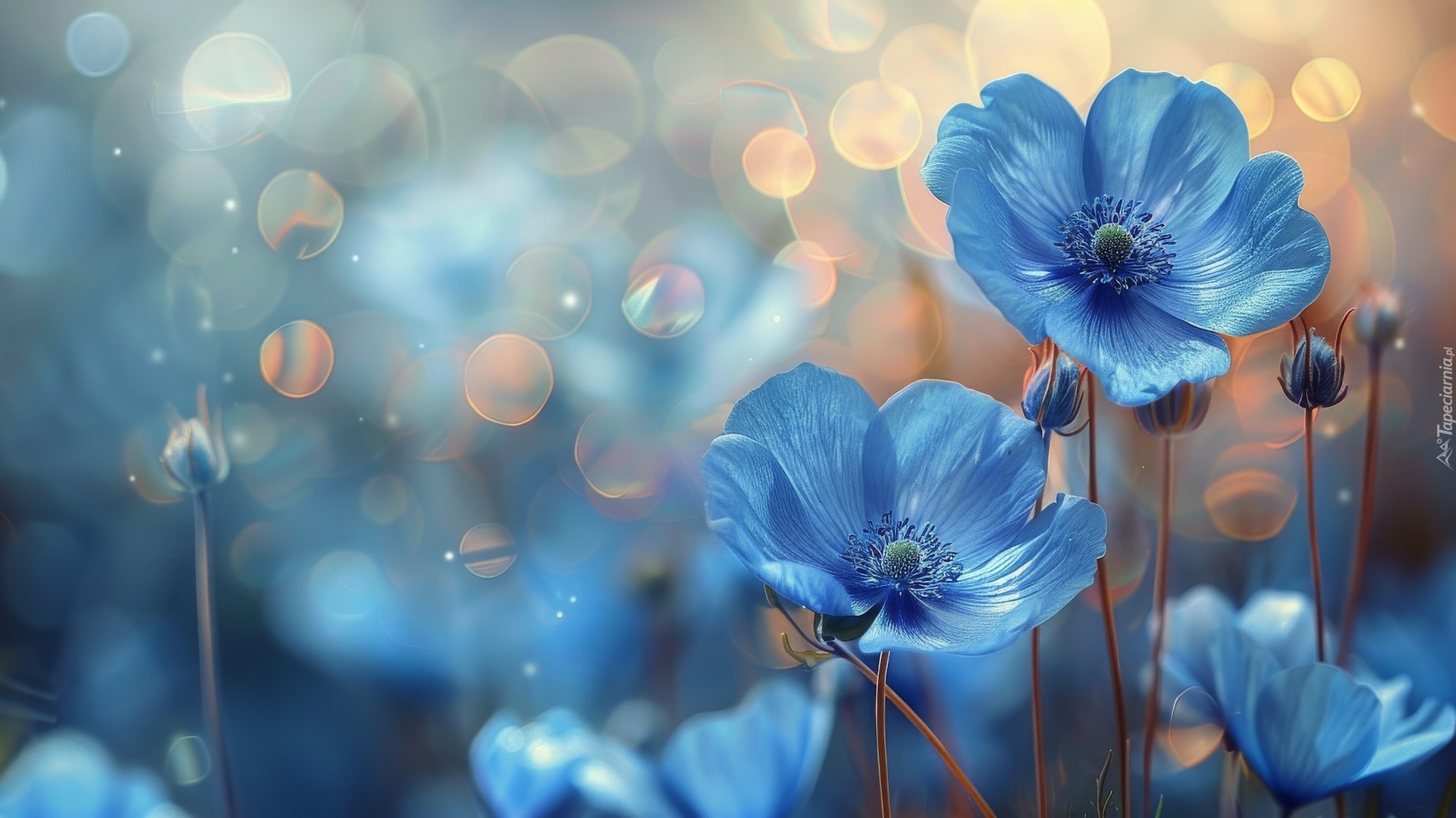 Edytor tapety: Niebieskie kwiaty w grafice na rozmytym tle