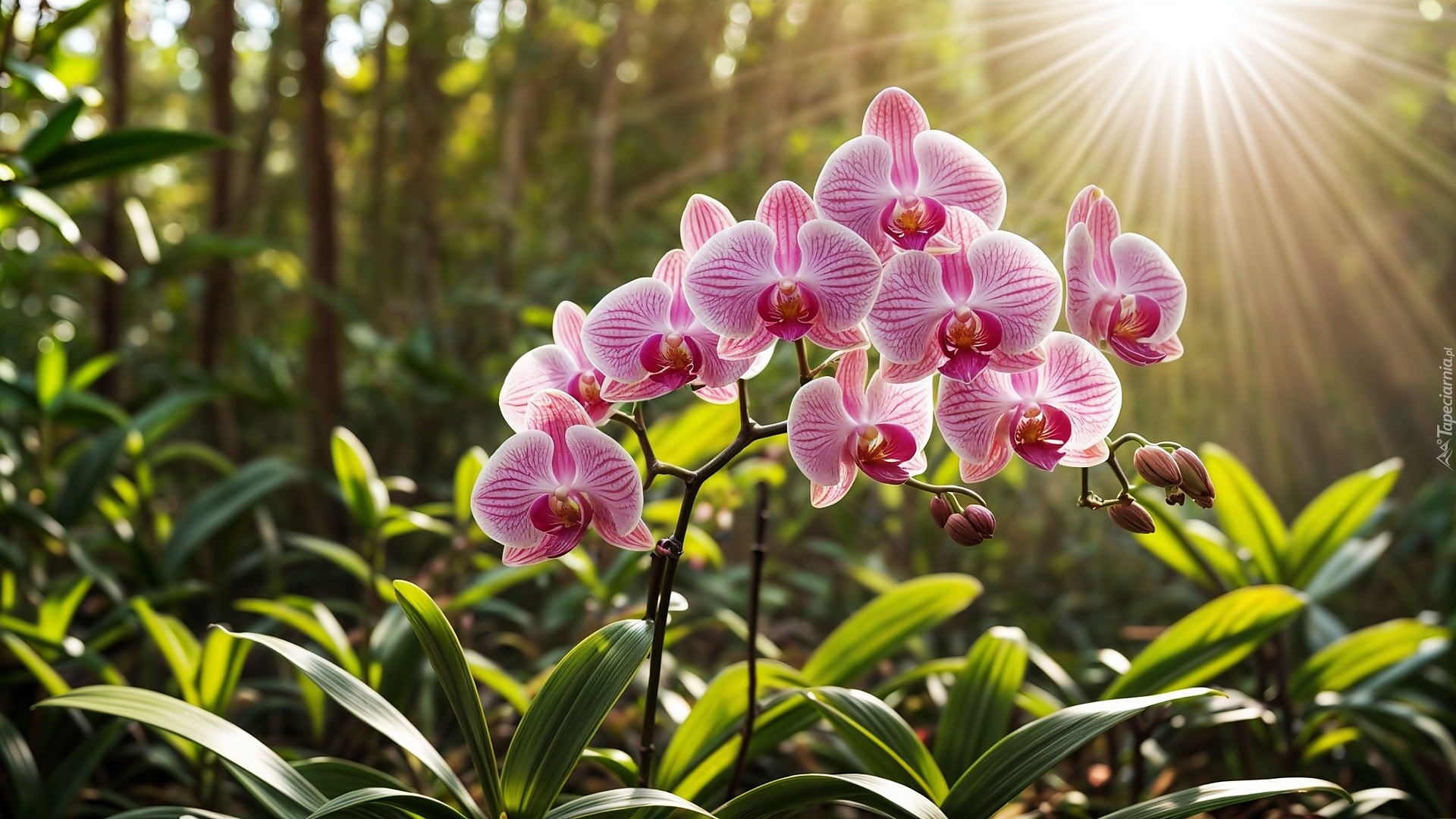 Edytor tapety: Różowe kwiaty storczyka z pąkami w promieniach słońca