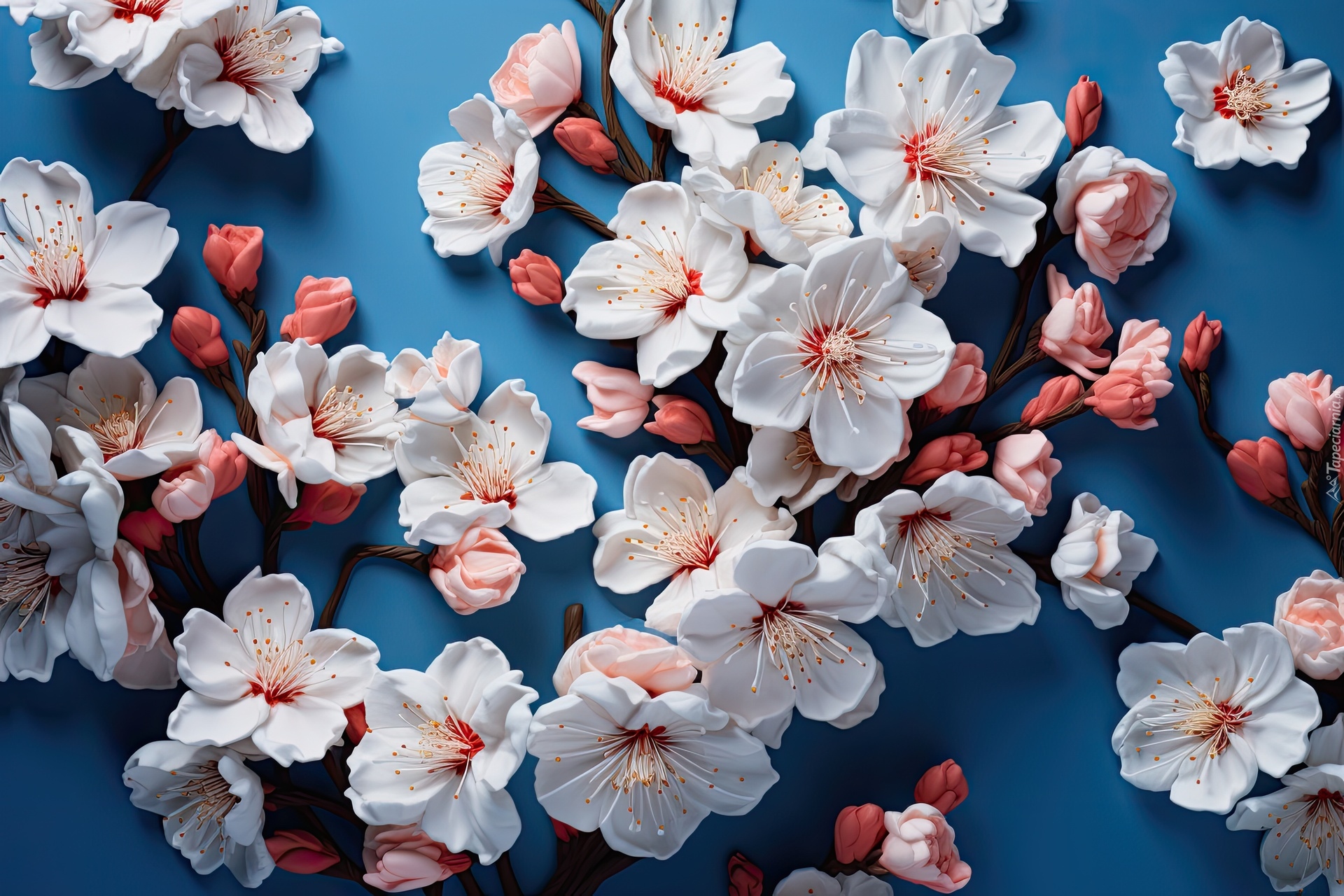 Edytor tapety: Białe kwiaty drzewa owocowego na niebieskim tle